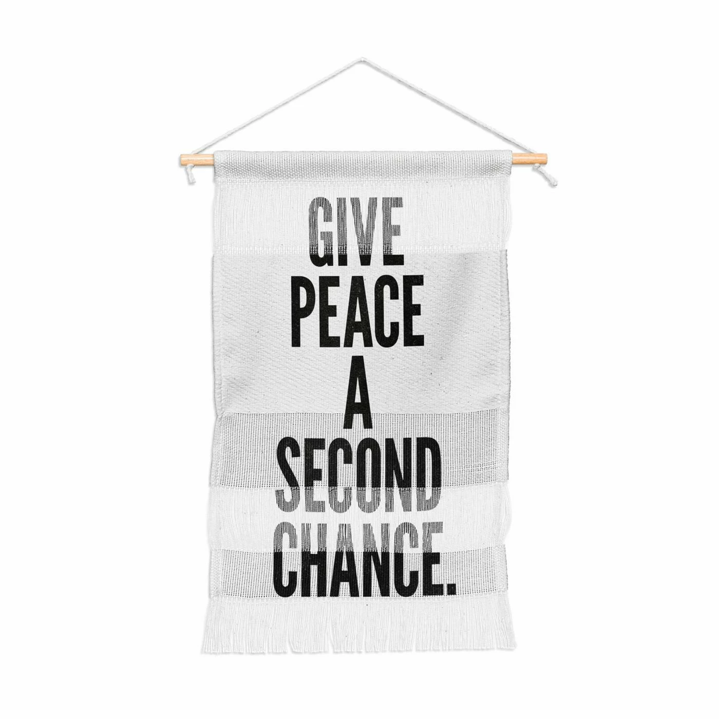 The black text of the Deny Designs Give Peace a Second Chance Portrait Wall Hanging is set against a subtle stripe background, creating a look that commands attention. This wall hanging is woven from polyester fibers and topped by a sturdy dowel rod and cord for hanging.