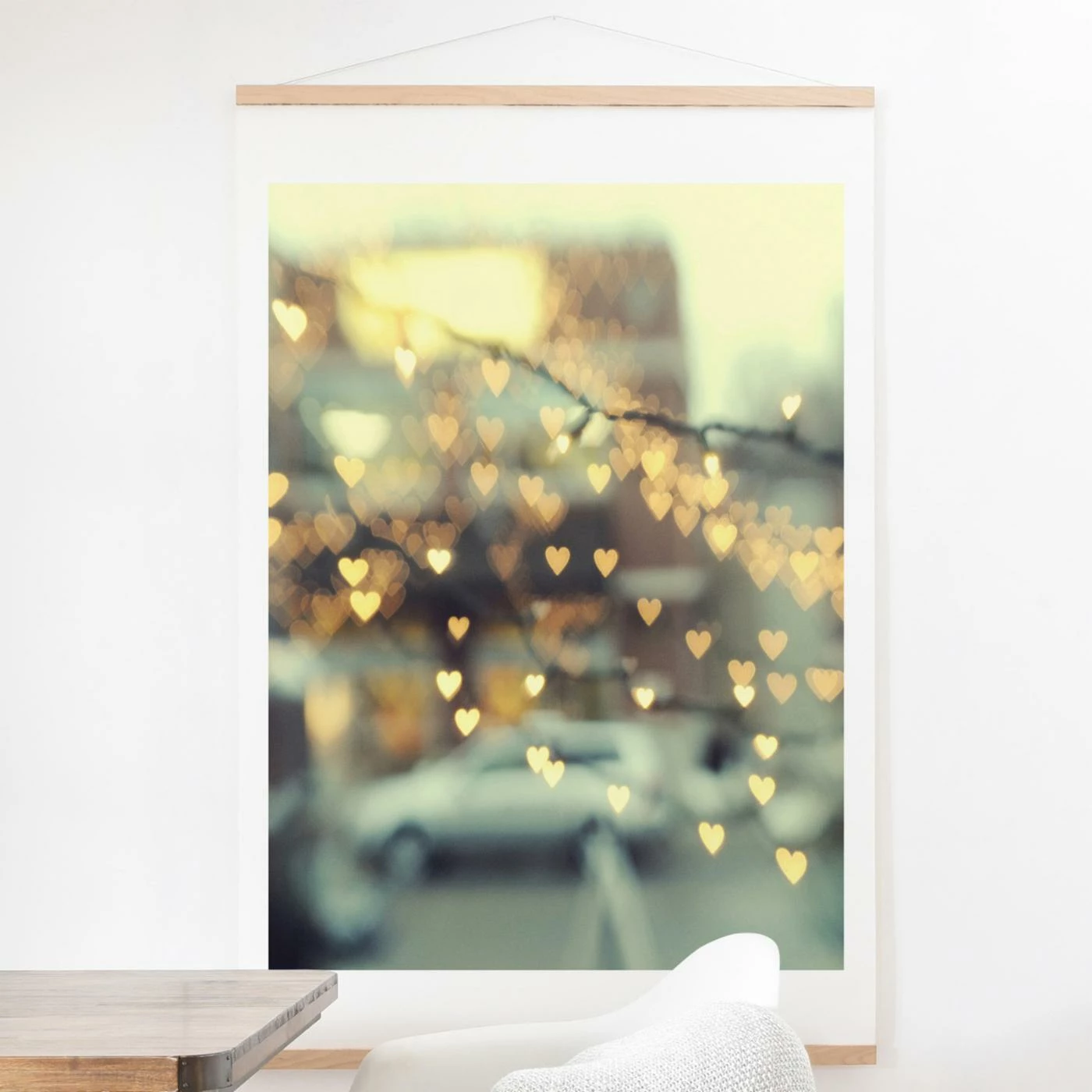 The Deny Designs Holding Onto Love Wall Tapestry features a blurred photographic image by Chelsea Victoria. Sparkling hearts are laid over a residential scene, with image being framed with crisp white borders. Wooden art hangers at the top and bottom give this image a scroll-style appearance. It comes with the necessary hanging hardware.