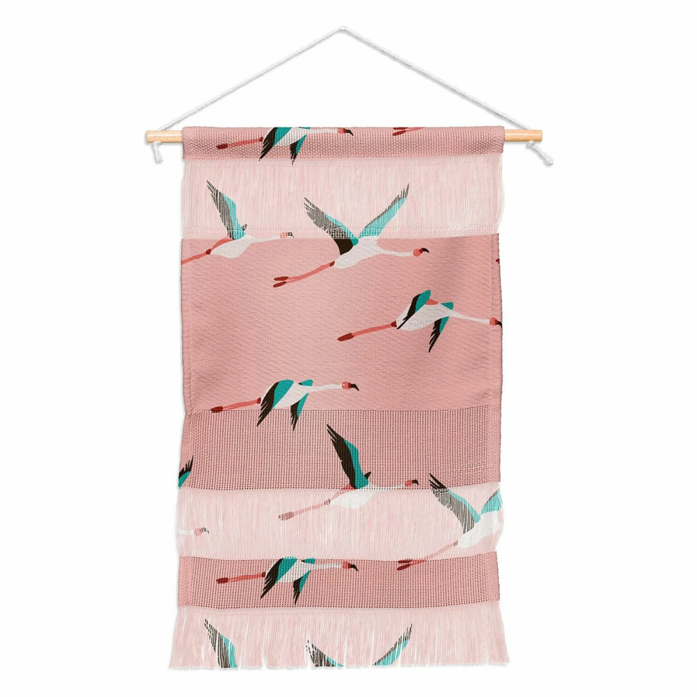 A flock of flamingos on the Deny Designs Holli Zollinger Flamingo Pink Hanging Tapestry adds a colorful touch to your walls. This woven polyester tapestry blends multicolored hues in his unique wall art. It hangs on a sturdy wooden rod for an easy installation.