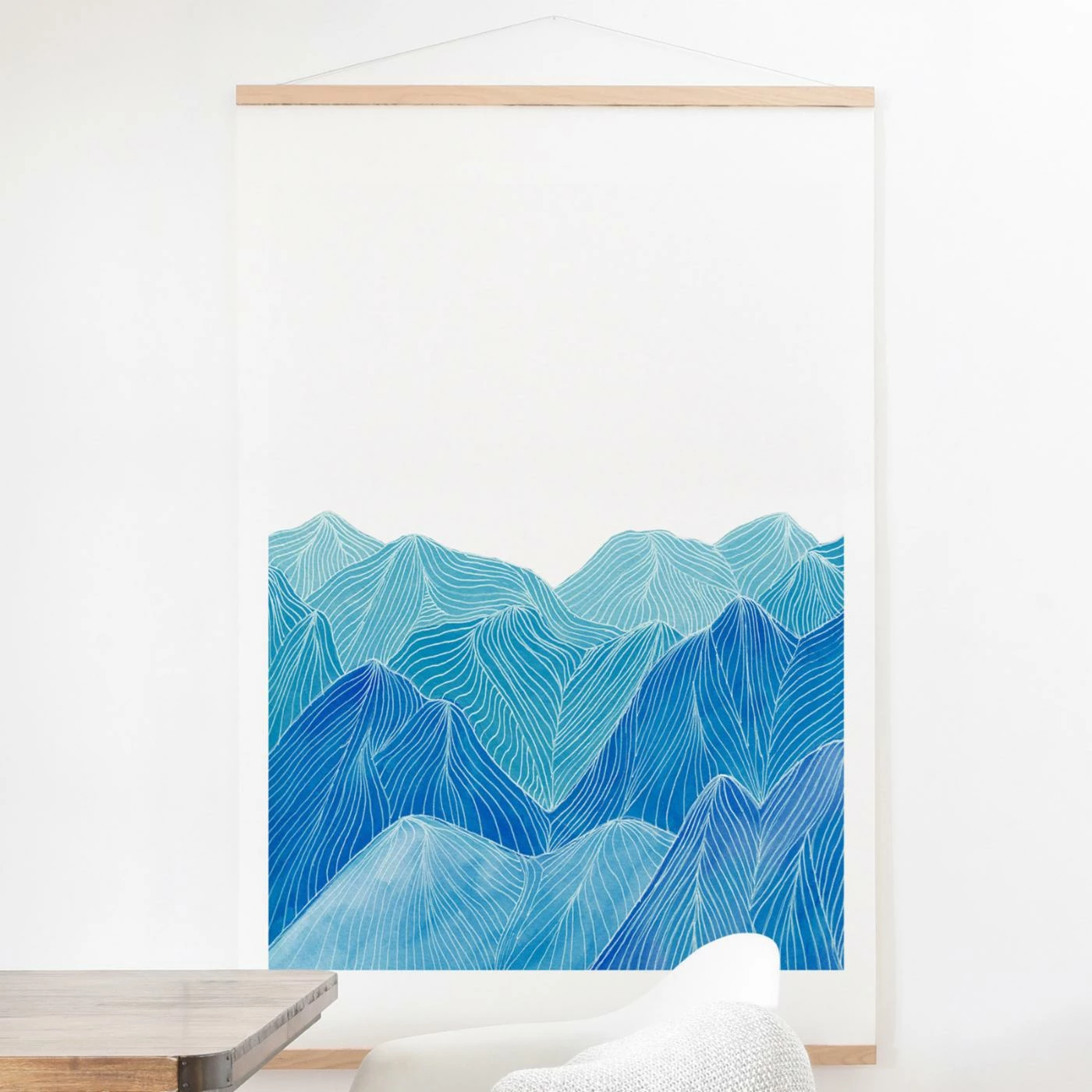 Dream of days spent at the mountains by decorating your walls with the Deny Designs Lines In The Mountains Viii Wall Scroll. This tranquil landscape features cool blue color tones and boasts a natural wood base for support.