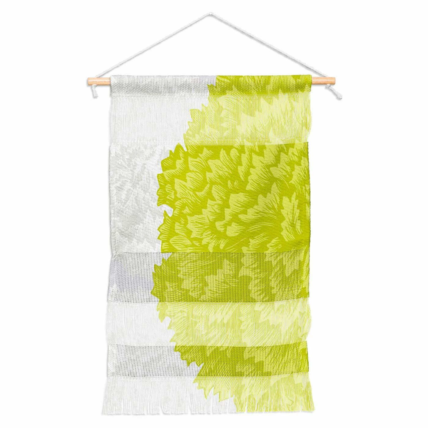 Fluorescent lime green tones give the Deny Designs Lucent Wall Hangingโs floral design attention-grabbing style. This wall tapestry is woven from durable polyester yarns and hung from a slender, yet strong wooden dowel.