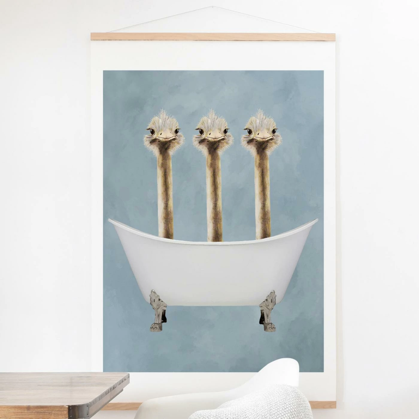 Bring a light, cheerful style to your bathroom dΓ©cor by hanging the Deny Designs Ostriches In Bathtub Wall Scroll. This fun print on cotton fiber paper arrives mounted and ready to hang using the included hardware.