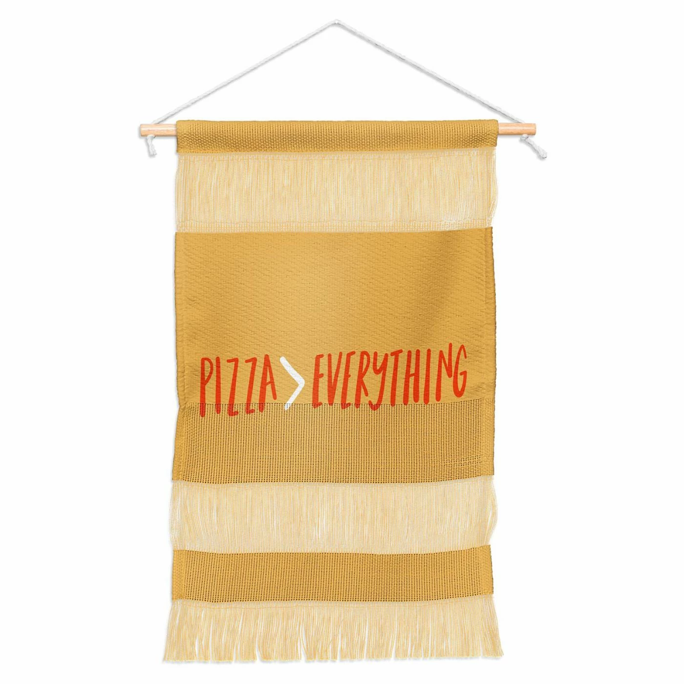 Broadcast your love of pizza with the Deny Designs Pizza is Better Than Everything Wall Hangingโs cheeky message. The sunny hues of this woven wall hanging make it an uplifting focal point on your wall. It is crafted from durable polyester yarns and hangs simply from a wooden dowel.