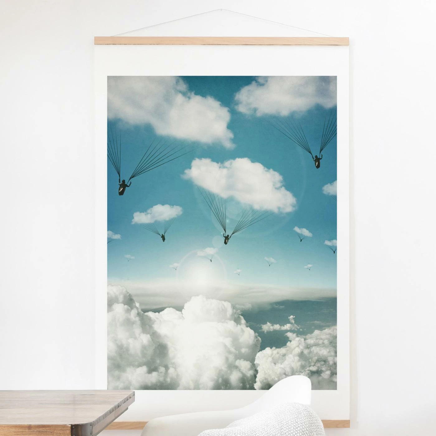 The Deny Designs Rain Bringers Wall Tapestry is a photorealistic image of people parachuting with clouds. This fantasy design by Belle13 is printed using long-lasting archival inks on pure cotton archival paper. It comes stretched between wooden hangers, giving it modern, gallery-style look, and it makes a great choice for a living room, bedroom or workspace wall.