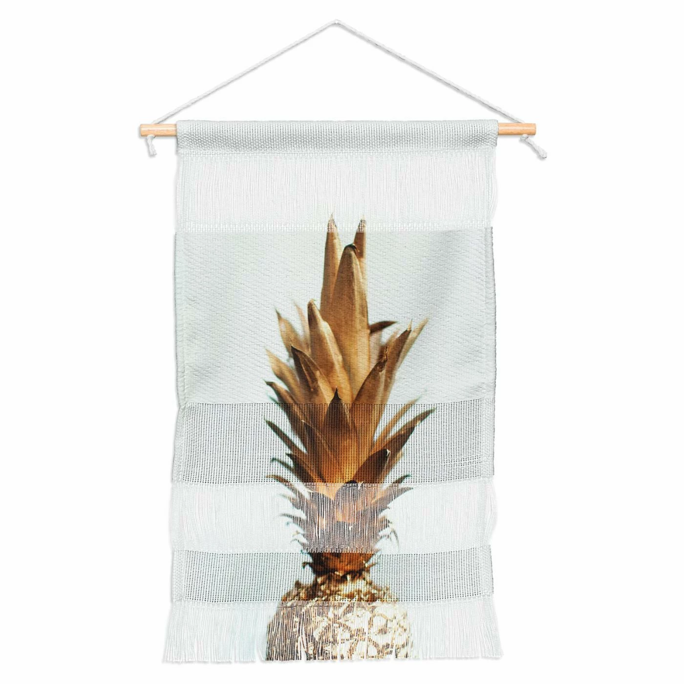 Golden tones add a regal element to the crown of a pineapple in the Deny Designs The Gold Pineapple Wall Hanging. This tropical wall hanging is woven from quality polyester yarns. It comes hanging on a strong wooden dowel, and is easy to add to your homeβs decor.