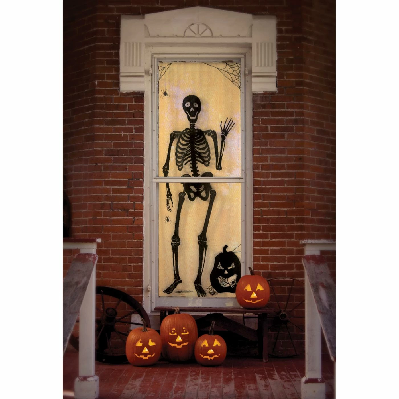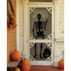 Greet trick-or-treaters this Halloween by hanging the Heritage Lace Bones Scenic Panel on your front door or window. This polyester panel is adorned with a smiling and waving black skeleton. It boasts fine gauge lace construction and is machine washable for easy cleaning.