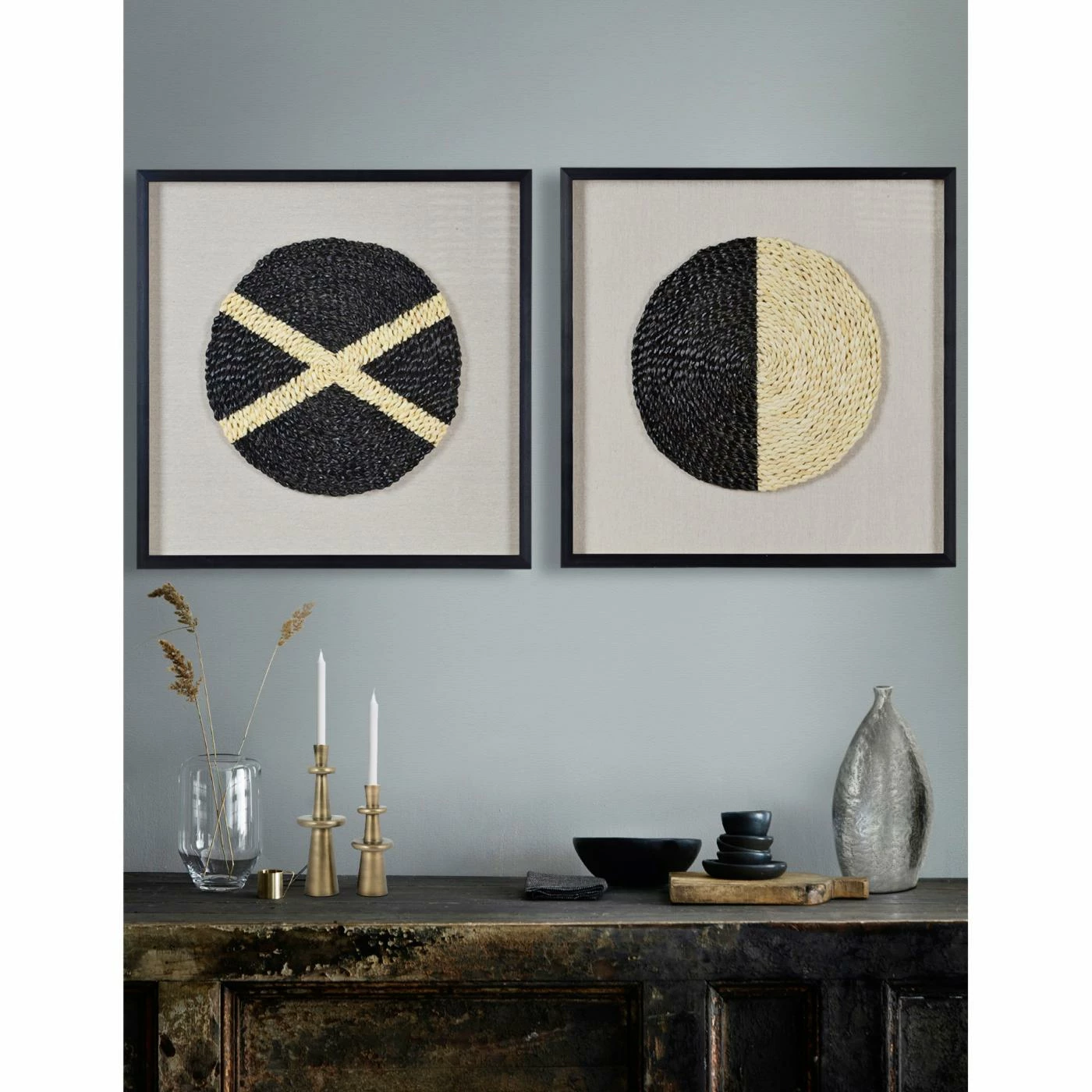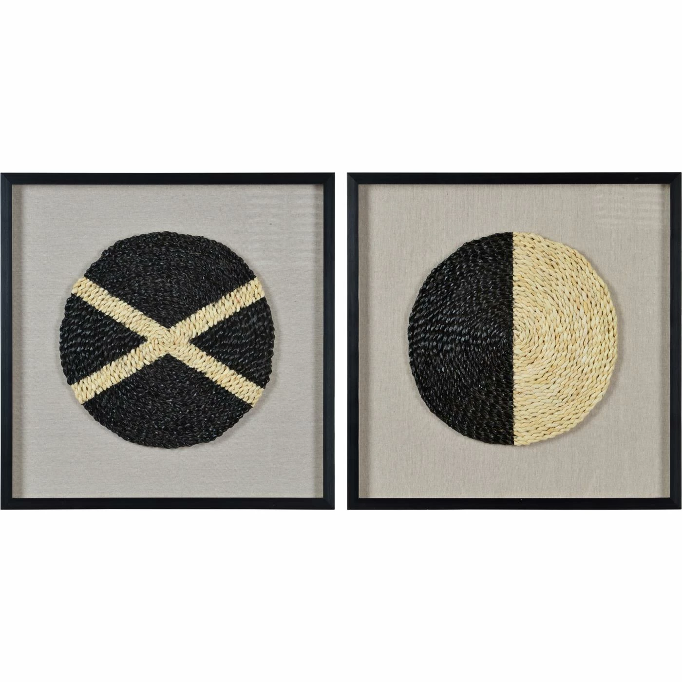 Pair the Renwil Genero 2 Piece Wall DΓ©cor with eclectic furniture and dΓ©cor to create a curated look in your space. These wall accents are displayed in black engineered wood frames, behind clear glass. Each piece features a linen background with a woven rattan circle at the center. Black and natural finishes create simple designs that make each design unique. For easy installation, the frames are equipped with hanging hardware.