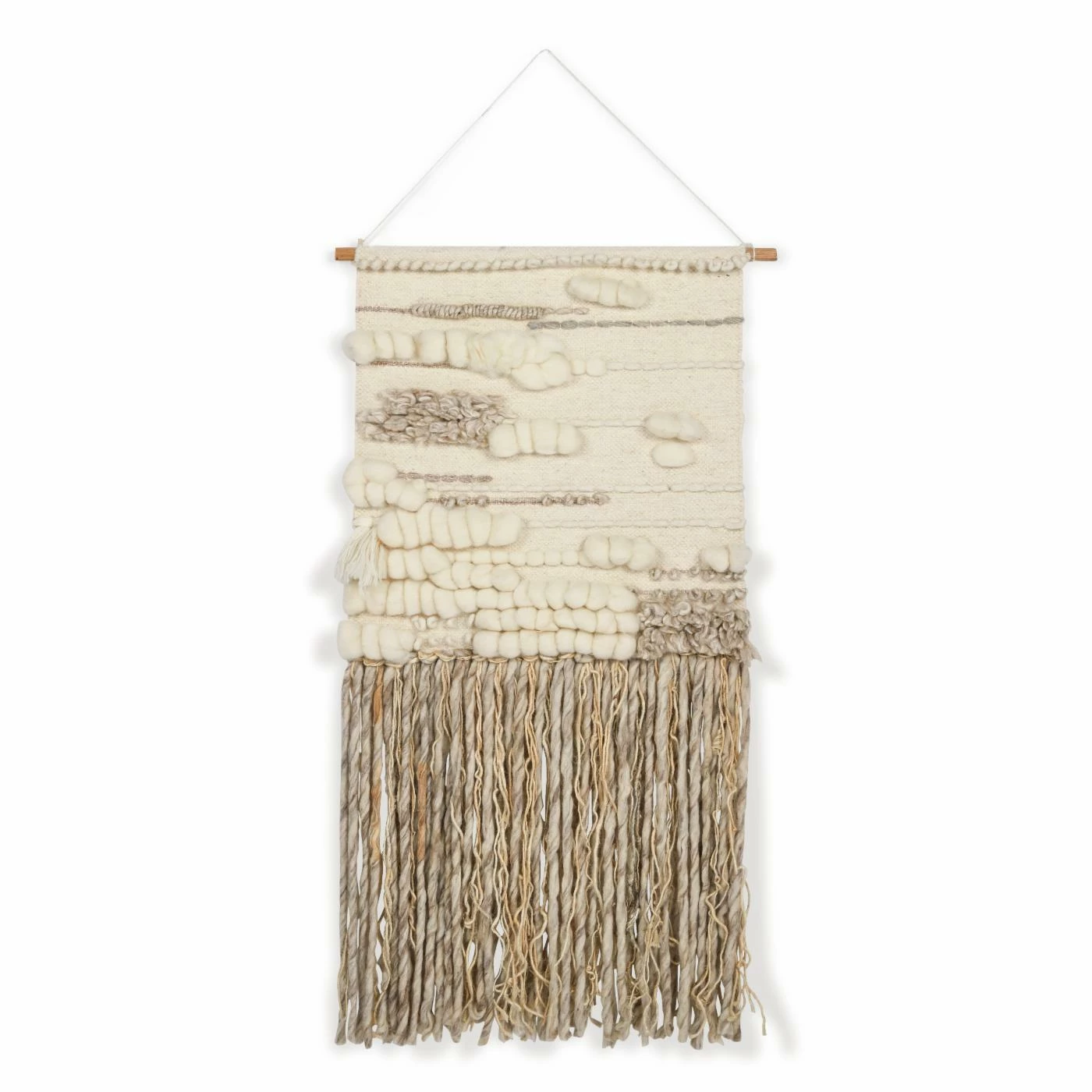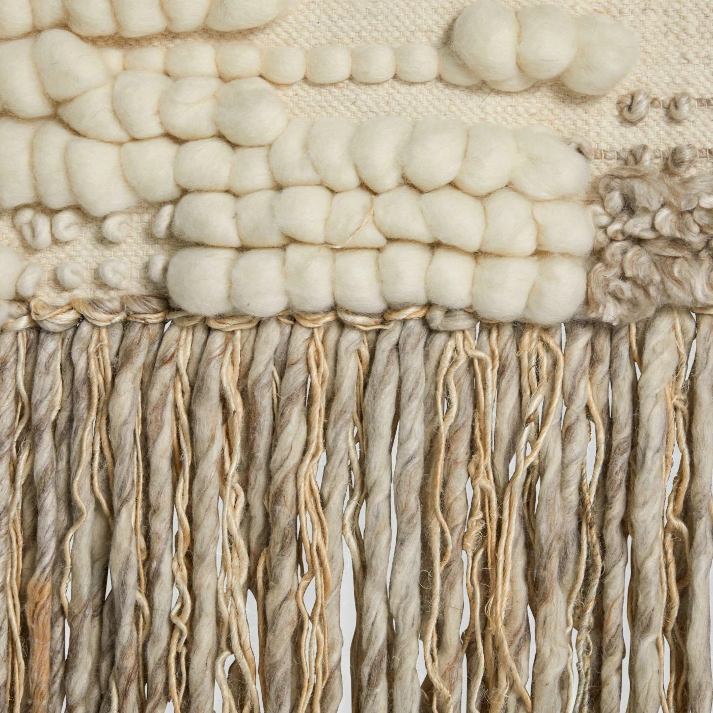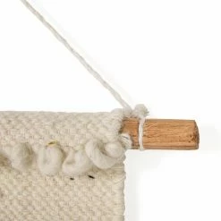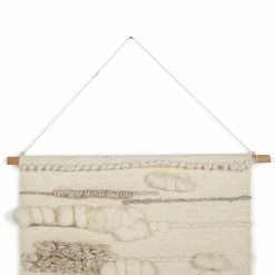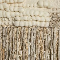Create a new focal point in a room or hallway with the Safavieh Sedona Woven Creme Wall Tapestry, which features an alluring bohemian vibe. Designed with a blend of puffy and shaggy textures that are complemented by a variety of striped detailing, this tapestry is chic with a capital C. The look is finished with a dangling trim that has a blend of kinky and straight fringes.