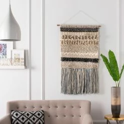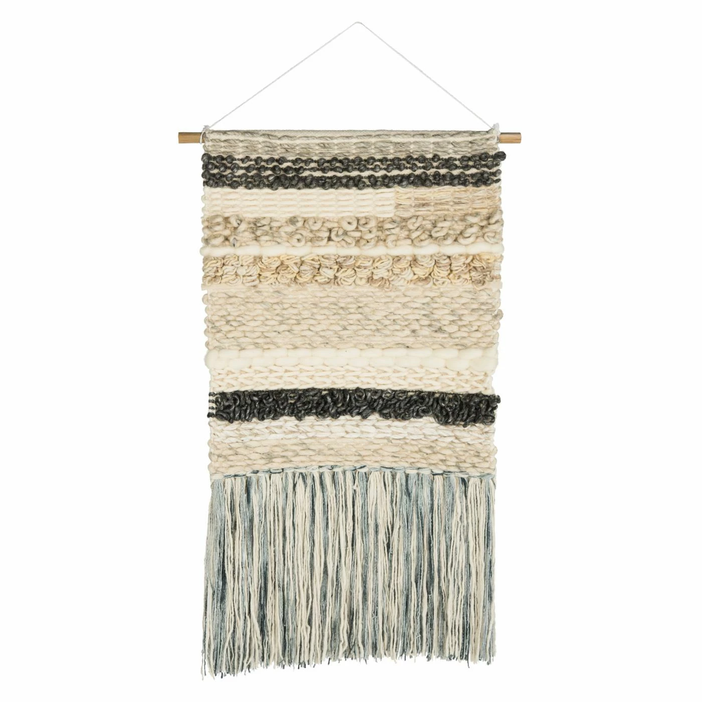 The Safavieh Sedona Woven Striped Wall Tapestry boasts a bohemian charm that’s difficult to resist. Made with a savvy blend of wool and bamboo viscose, it features a combination of textures that are enhanced by a variety of earthy hues. The look is finished with long, fringe trim that’s designed with a fashionable blend of blue and ivory fibers.