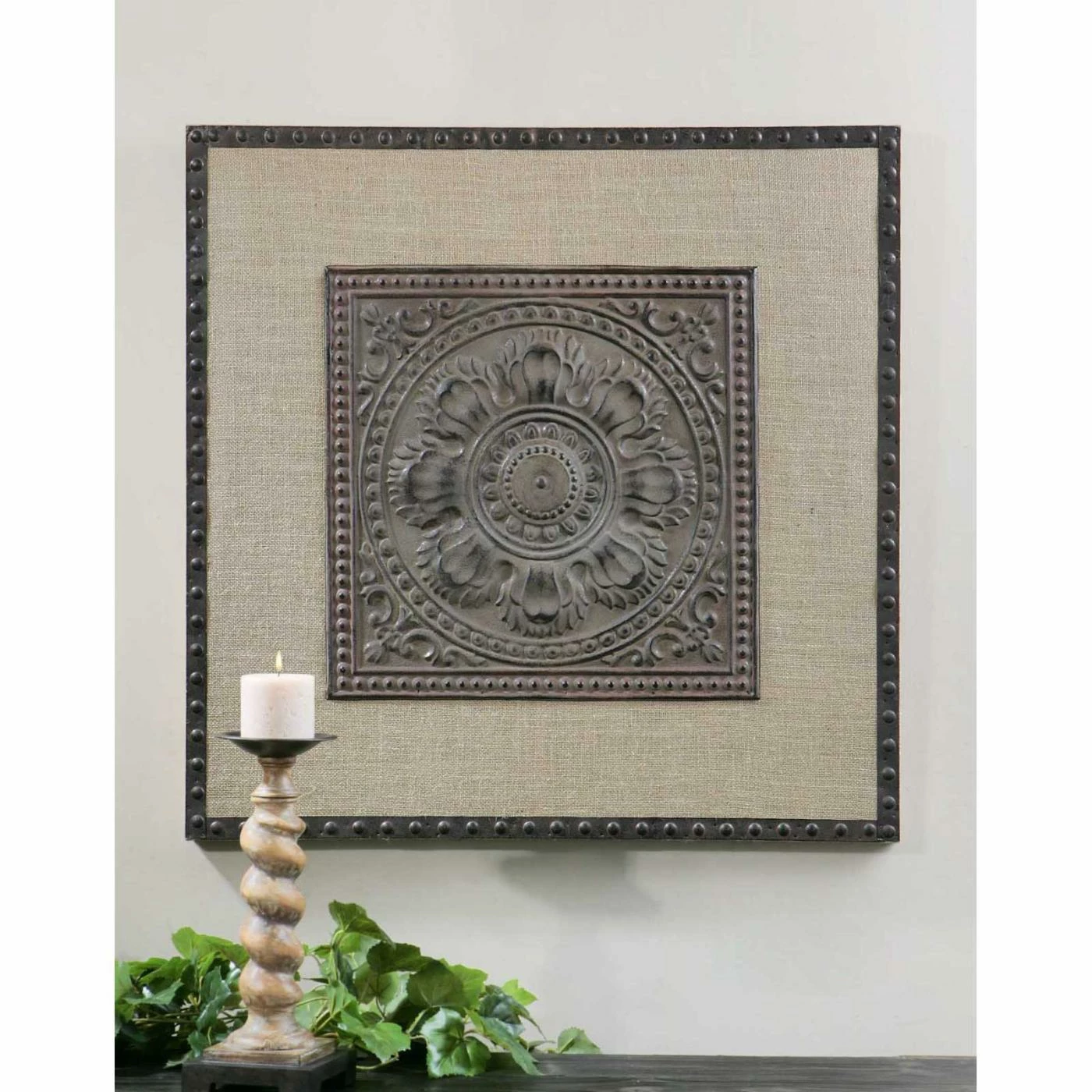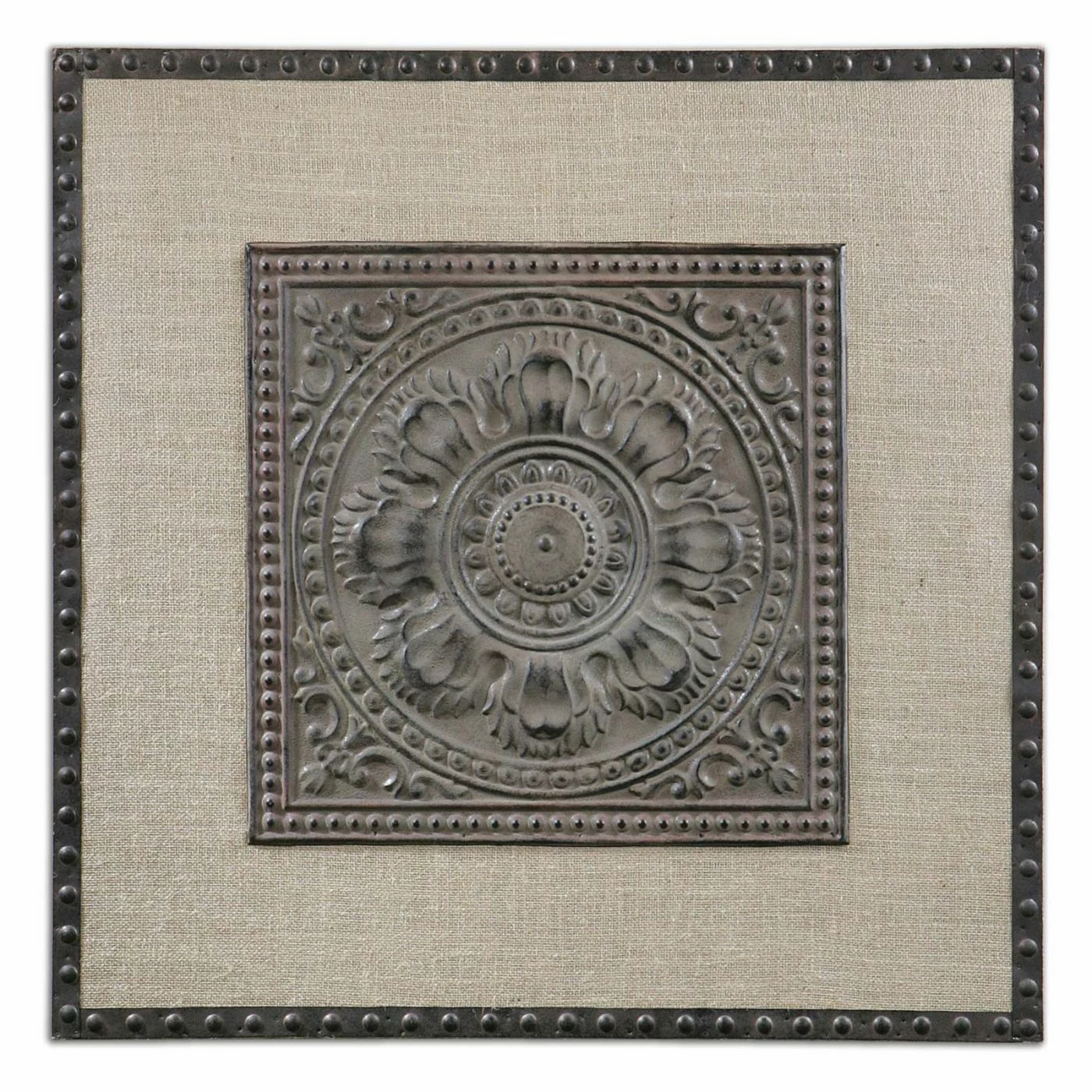 A great transitional piece that helps to marry hard-edged, industrial-style decor to pieces that represent your softer side, the Uttermost Filandari Stamped Metal Wall Art is a captivating accent for any room. A riveted black frame surrounds a rustic burlap matting, which sets the scene for an intricate stamped metal square with a floral medallion. This Victorian-era metal plaque features a beaded border and is distressed to perfection with a burnished gray patina finish.