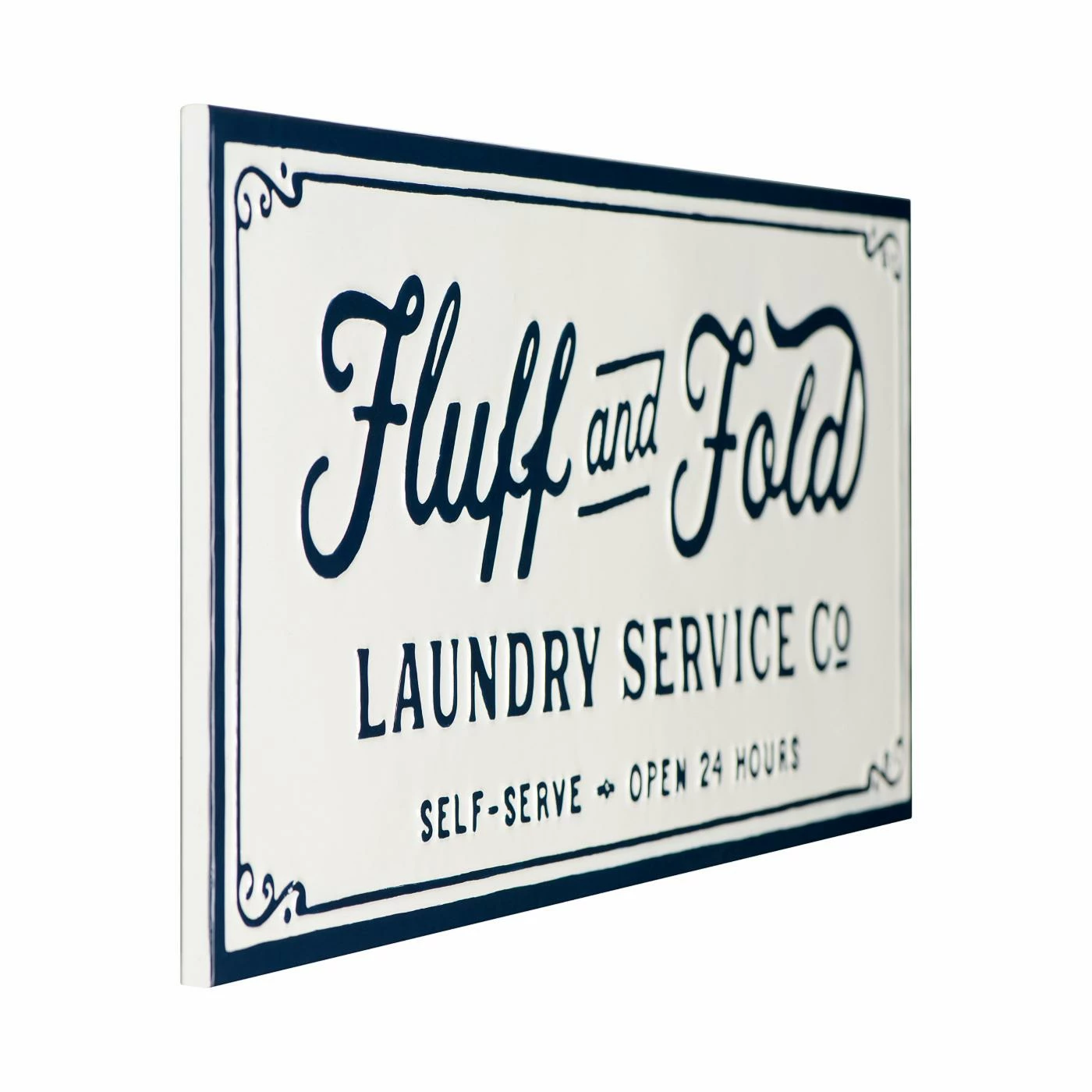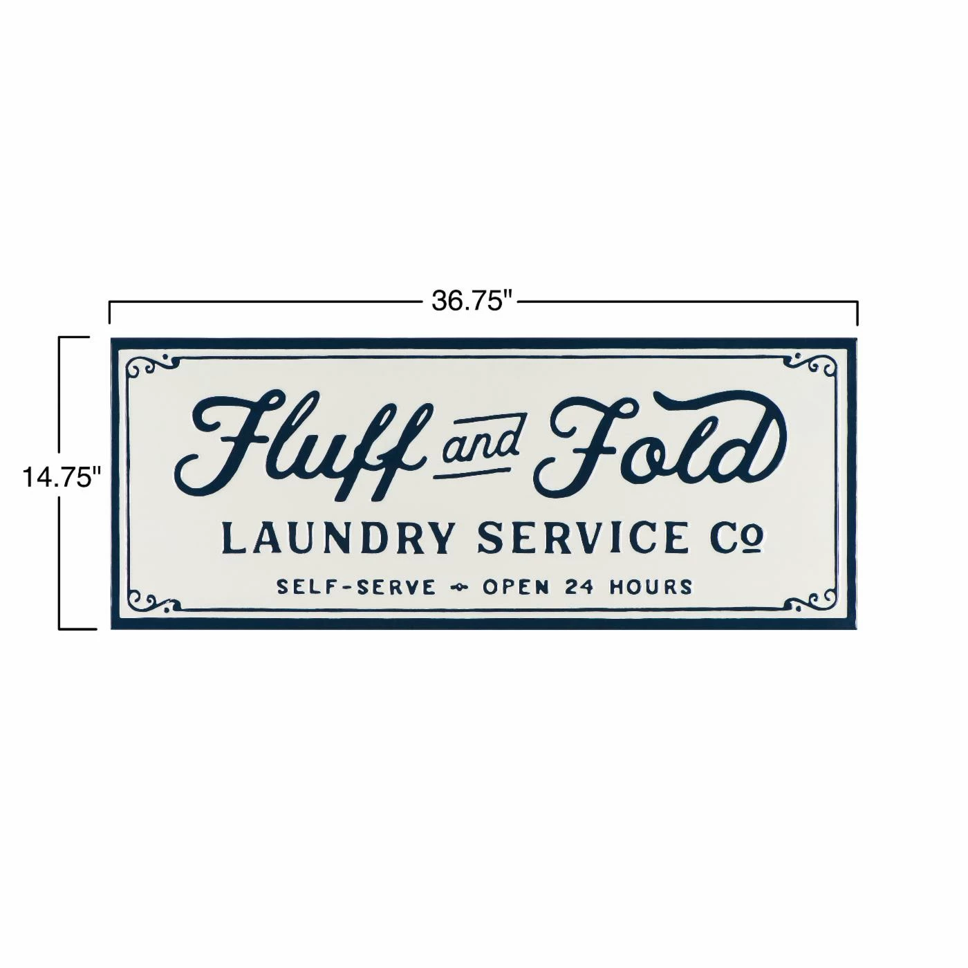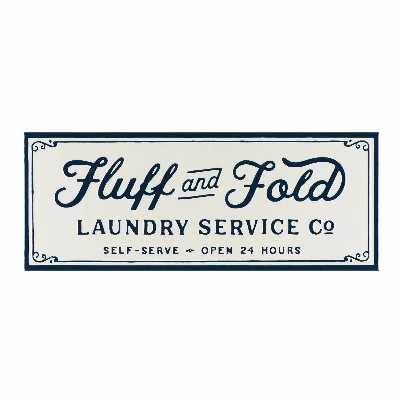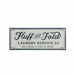 Make doing the laundry a little less boring with the 3R Studios Embossed Fluff and Fold Enameled Metal Wall Decor. This whimsical white-and-navy sign features a pretty script mentioning a laundry service company which is open 24 hours a day for self-service. Hang this metal sign up near your laundry area, or put it with other wordy signs for a gallery wall inspired look. No assembly is required before hanging.