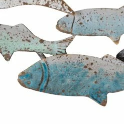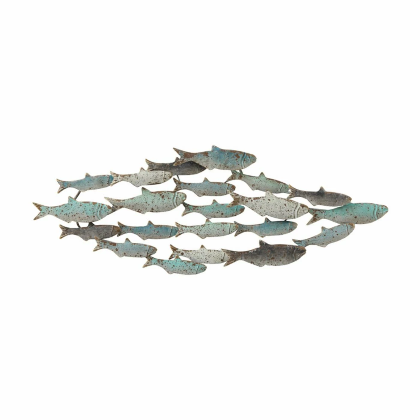 Depicting a school of fish in formation, the 3R Studios Metal School of Fish Wall Decor goes swimmingly with coastal dΓ©cor. The metal wall sculpture bears a distressed blue and white finish and can be hung in just minutes using the attached hardware.