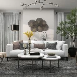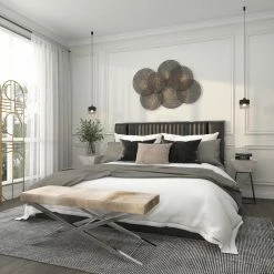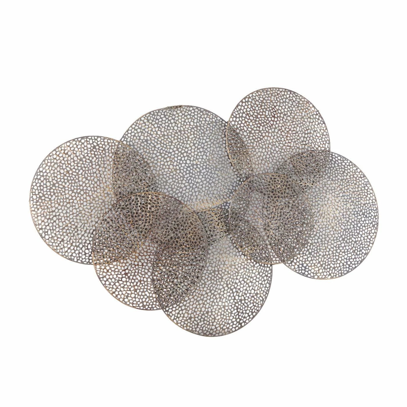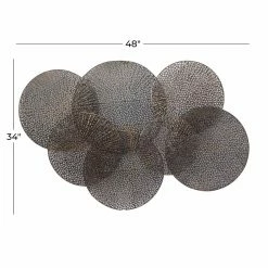 Overlapping perforated iron circles give the DecMode Circular Perforated Wall Sculpture a contemporary look and allow the paint or paper on your wall to show through. This sturdy black wall hanging comes ready to display with integrated hangers.