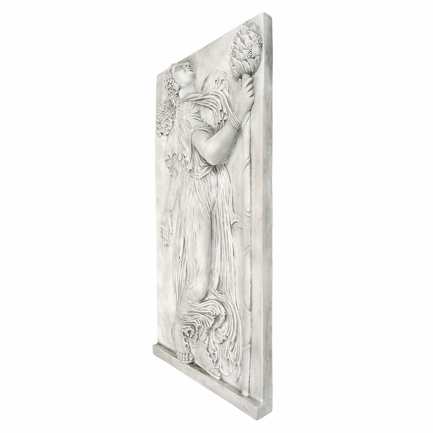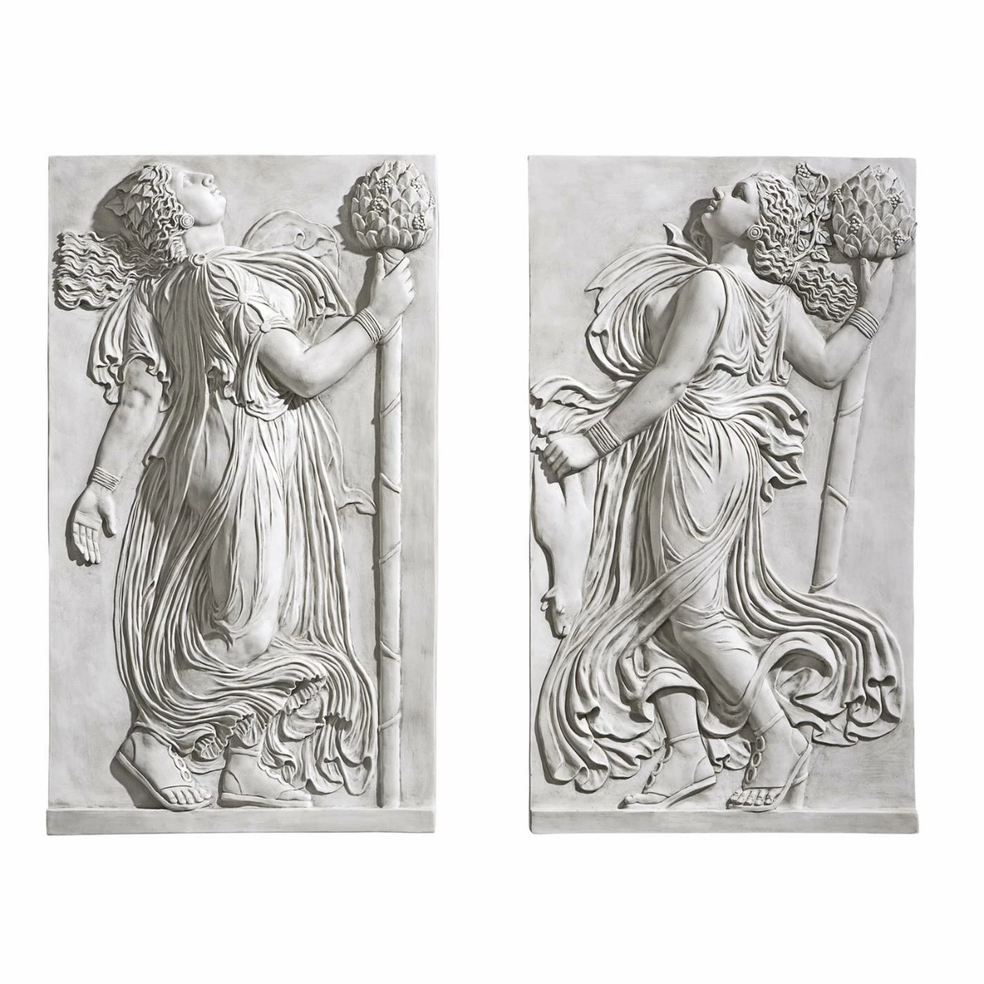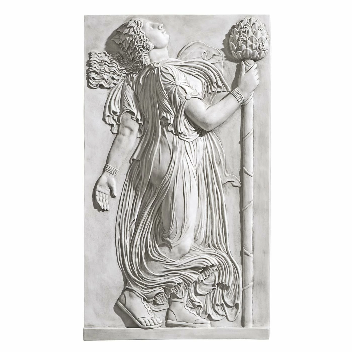 Share your knowledge of mythology with the Dancing Greek Maenad with Thyrsus Wall Frieze. This relief wall art showcases a follower of Dionysus, the god of wine, as she proudly dances, holding a staff meant to symbolize prosperity and fertility.