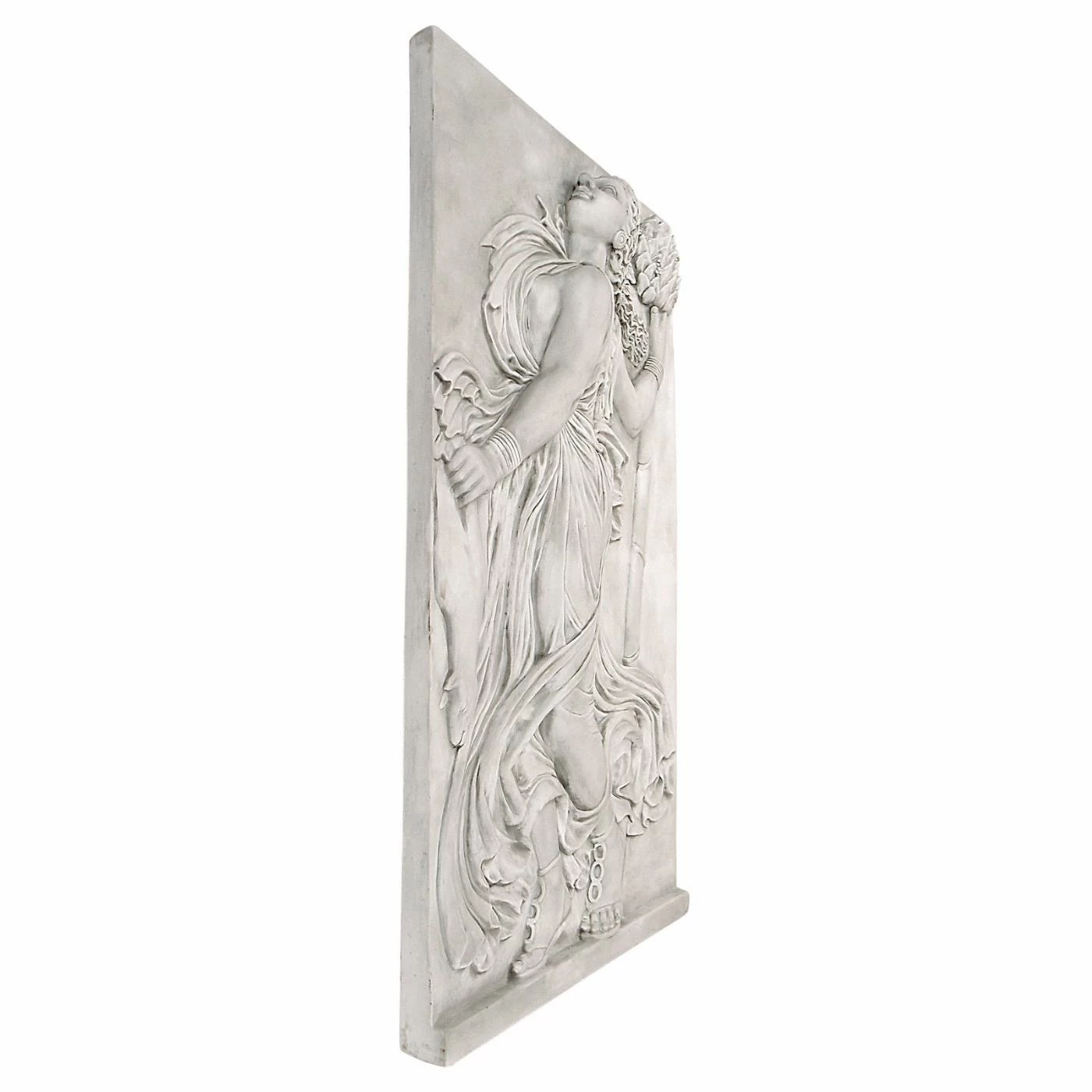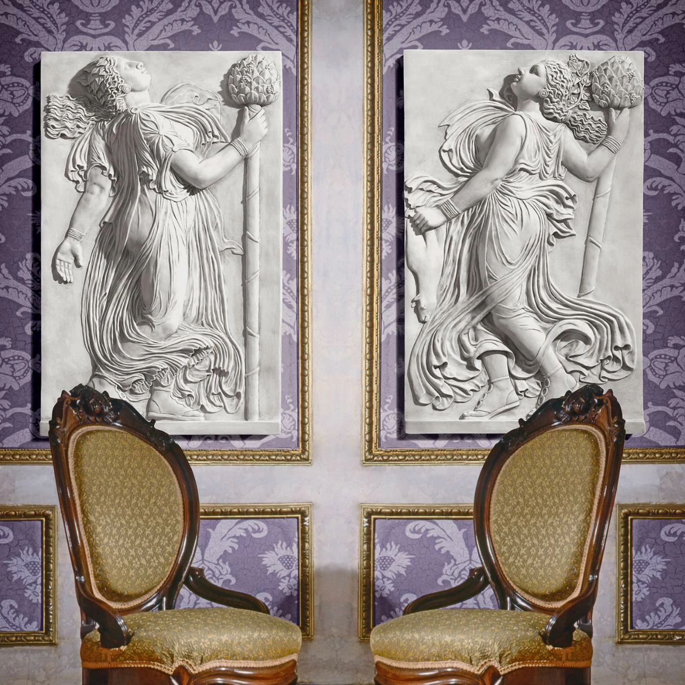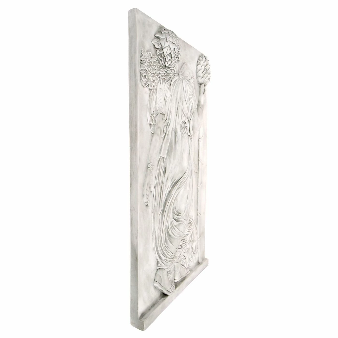 Share your knowledge of mythology with the Dancing Greek Maenad with Thyrsus Wall Frieze. This relief wall art showcases a follower of Dionysus, the god of wine, as she proudly dances, holding a staff meant to symbolize prosperity and fertility.