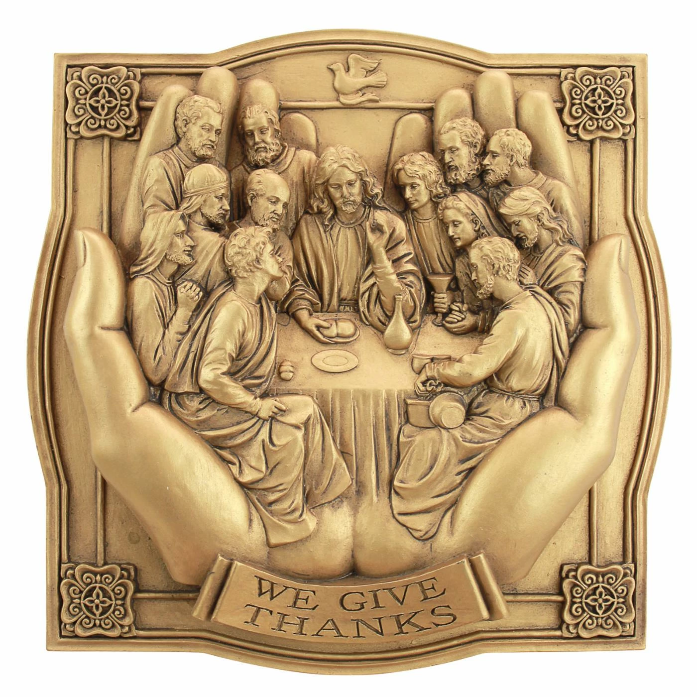 Show your gratitude for the love of the Lord with the Design Toscano Giving Thanks Lords Supper Wall Sculpture. This high-relief sculpture shows Jesus with his disciples within two hands and is ornamented by a dove and corner medallions.
