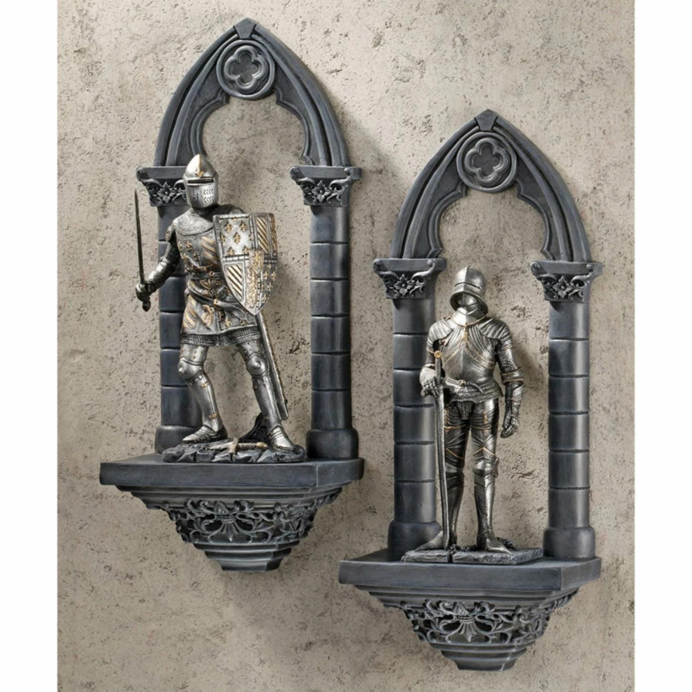 Let the Design Toscano Knights of the Realm 3-Dimensional Wall Sculpture stand guard over your home in his traditional gray armor. This valiant wall sculpture is cast of high-quality resin and designed with realistic detail, adding depth and dimension to your space.