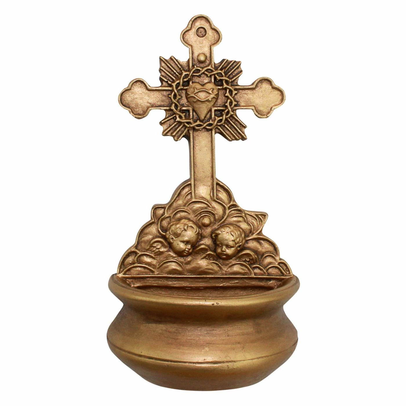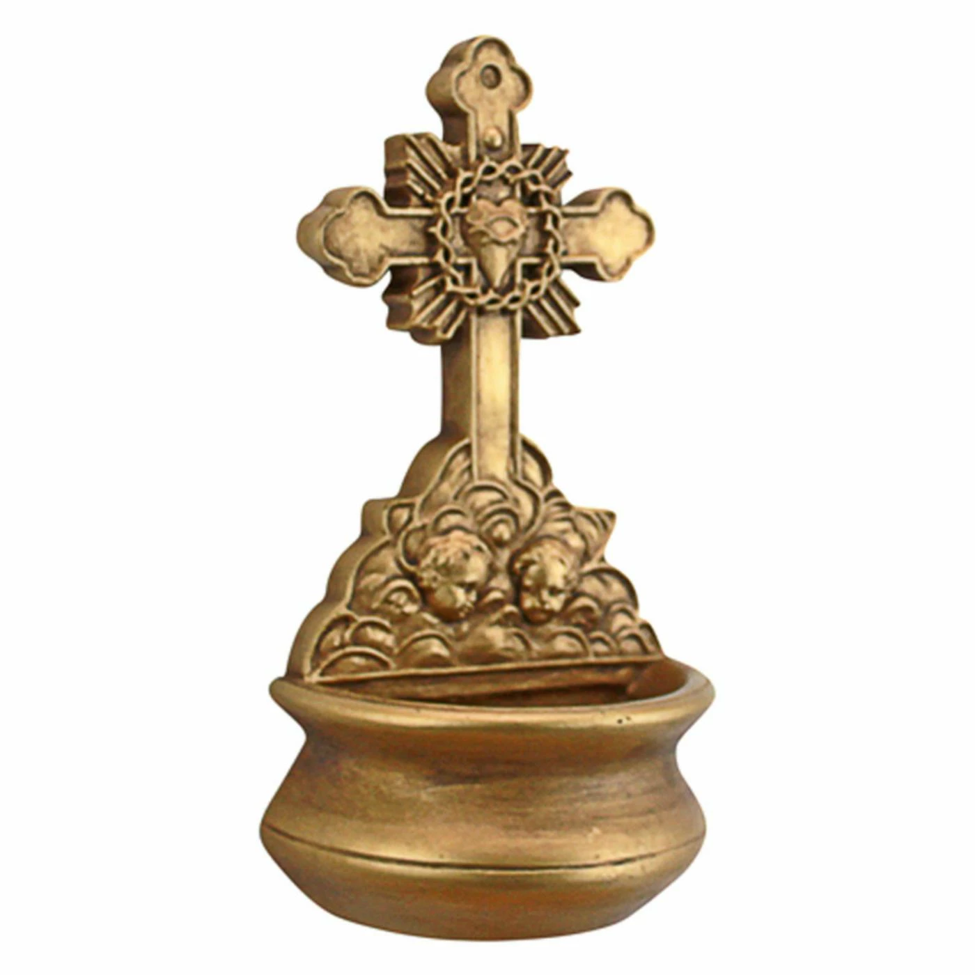 With its gold finish and intricate detailing, the Design Toscano Most Sacred Heart of Jesus Wall Font Sculpture makes a stunning addition to your home. This gold-tone resin font features a small font bowl. Over the font, a cross with quatrefoil details makes a home for the sacred heart, surrounded by a crown of thorns.