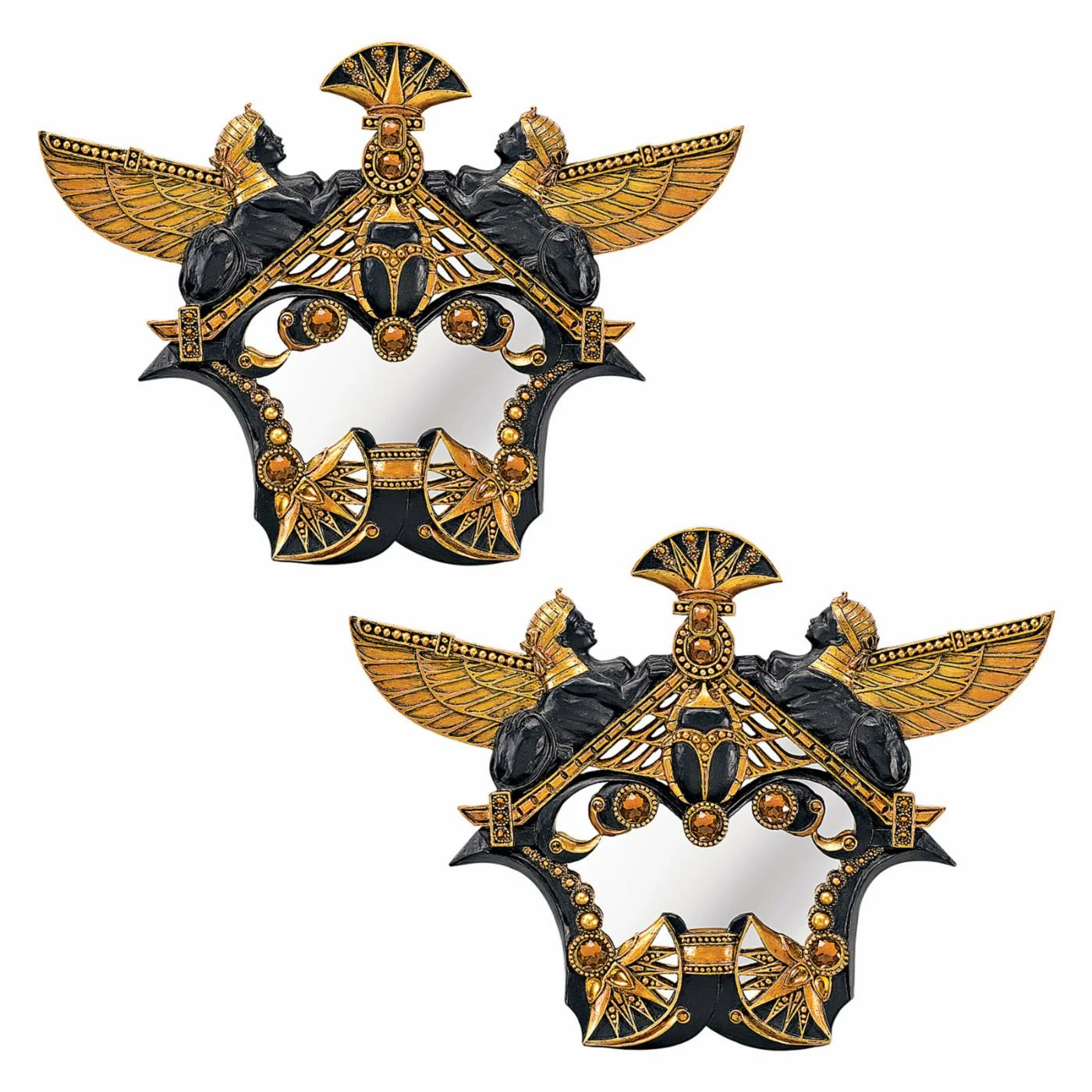 Sparkling genuine amber jewels and a hand-painted ebony and gold finish give the Design Toscano Temple of Karnak Mirrored Wall Sculpture – Set of 2 statement-making glam appeal. The Egyptian revival sculptures are made out of resin, so each one weighs only 1 pound for easy hanging. Sleek, mirrored glass shines at the center of each sculpture.