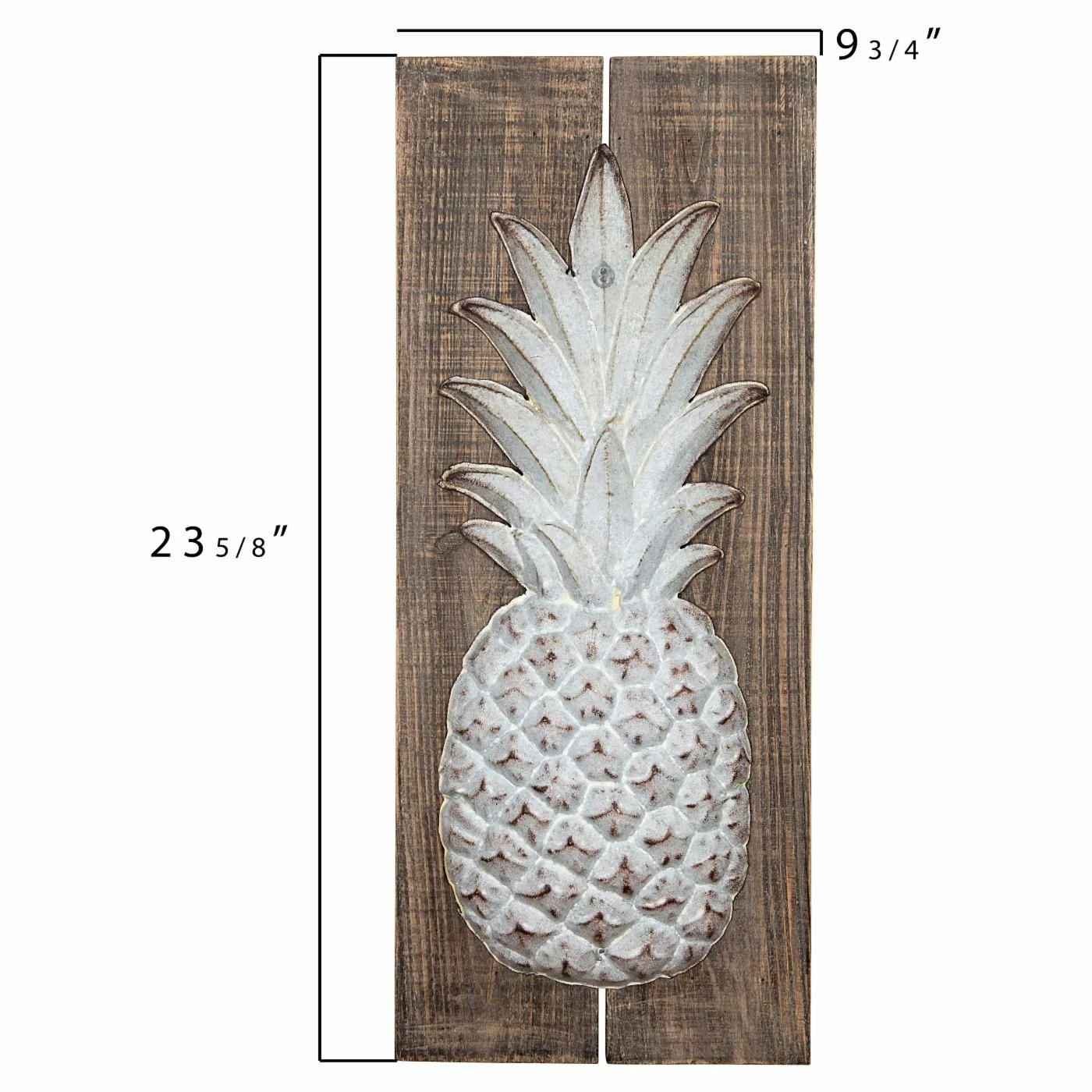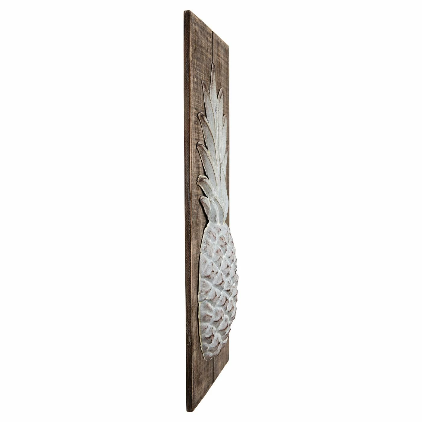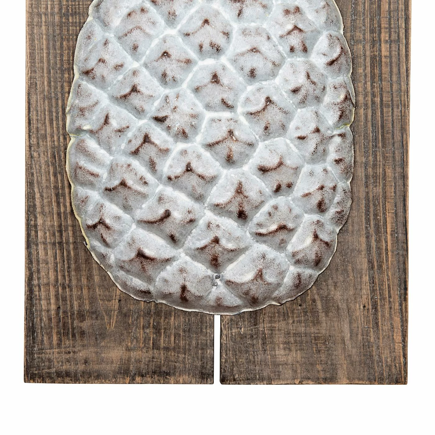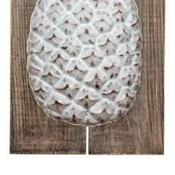 - Textured metal pineapple on wood plank base