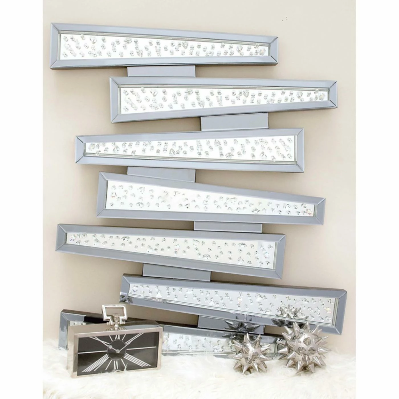 Update your space with edgy glam style with the DecMode 48W x 42H in. 7 Section Mirror and Glass Geometric Wall Sculpture. The glittering glass and mirror design is finished in cool blue and green tones. Suspended jewels over the mirrors catch the light and add a luxurious accent.