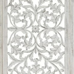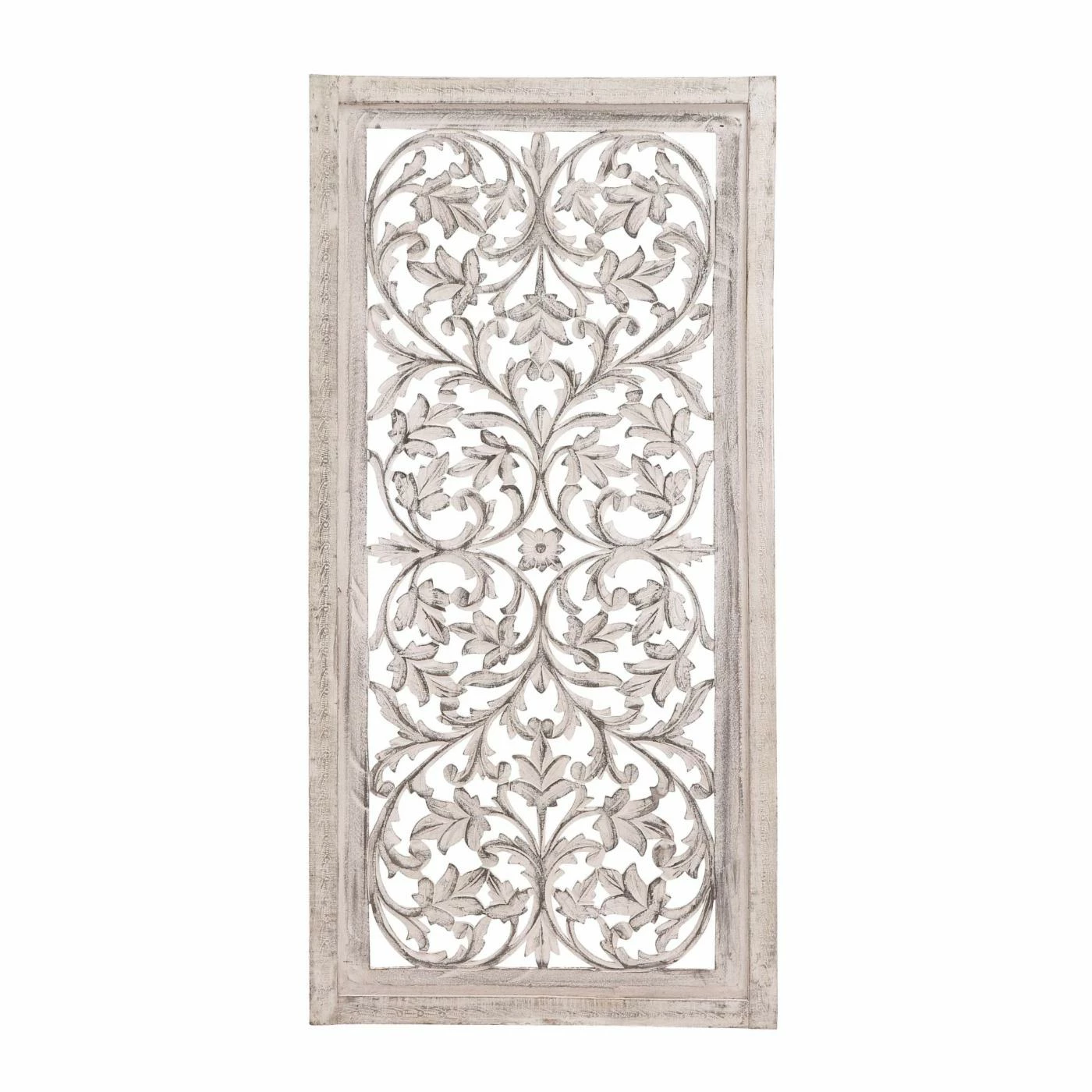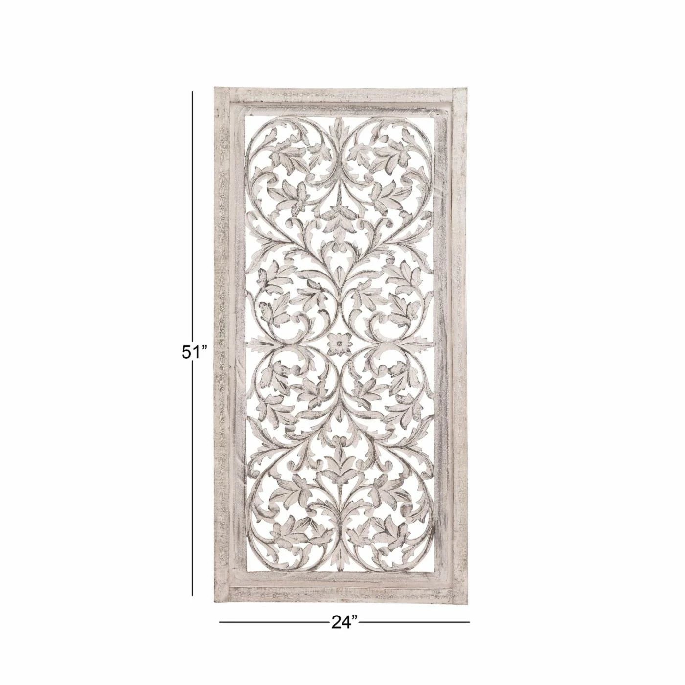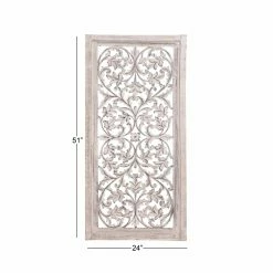 Dress up your wall decor with the DecMode 51 in. Wall Panel. This piece features a shabby chic finish and intricate floral scrollwork for a bit of feminine flair.