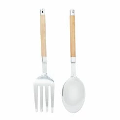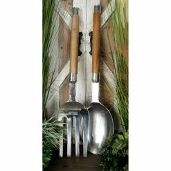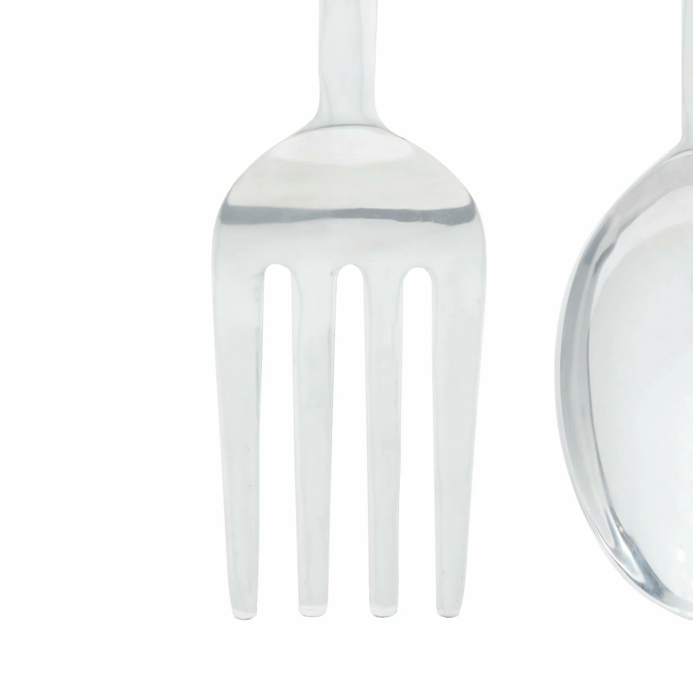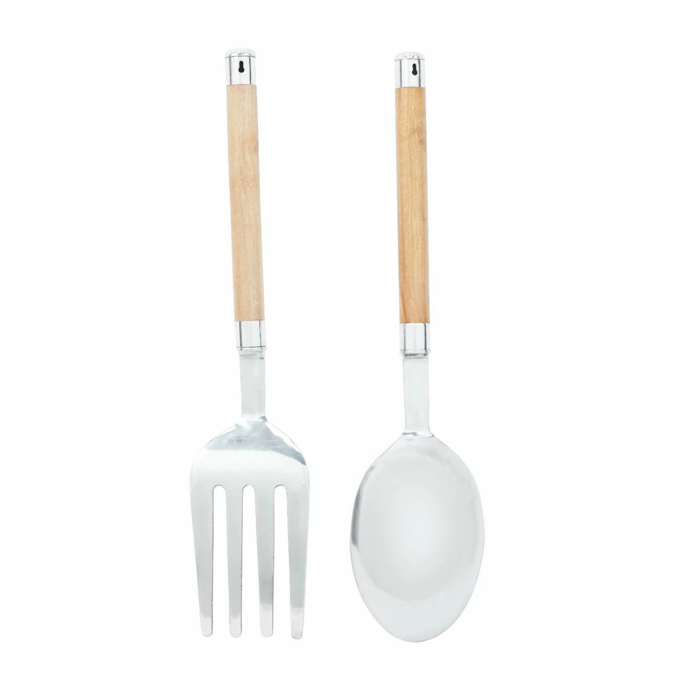 A contemporary take on classic kitchen decor, the DecMode Aluminum Kitchen Fork and Spoon Wall Sculpture – Set of 2 includes an oversized fork and spoon in polished silver. Each utensil is crafted of solid aluminum with a mango wood dowel handle capped in more polished silver aluminum. The fork is a four-prong design and the spoon is a dessert spoon. Multiple size options are available.