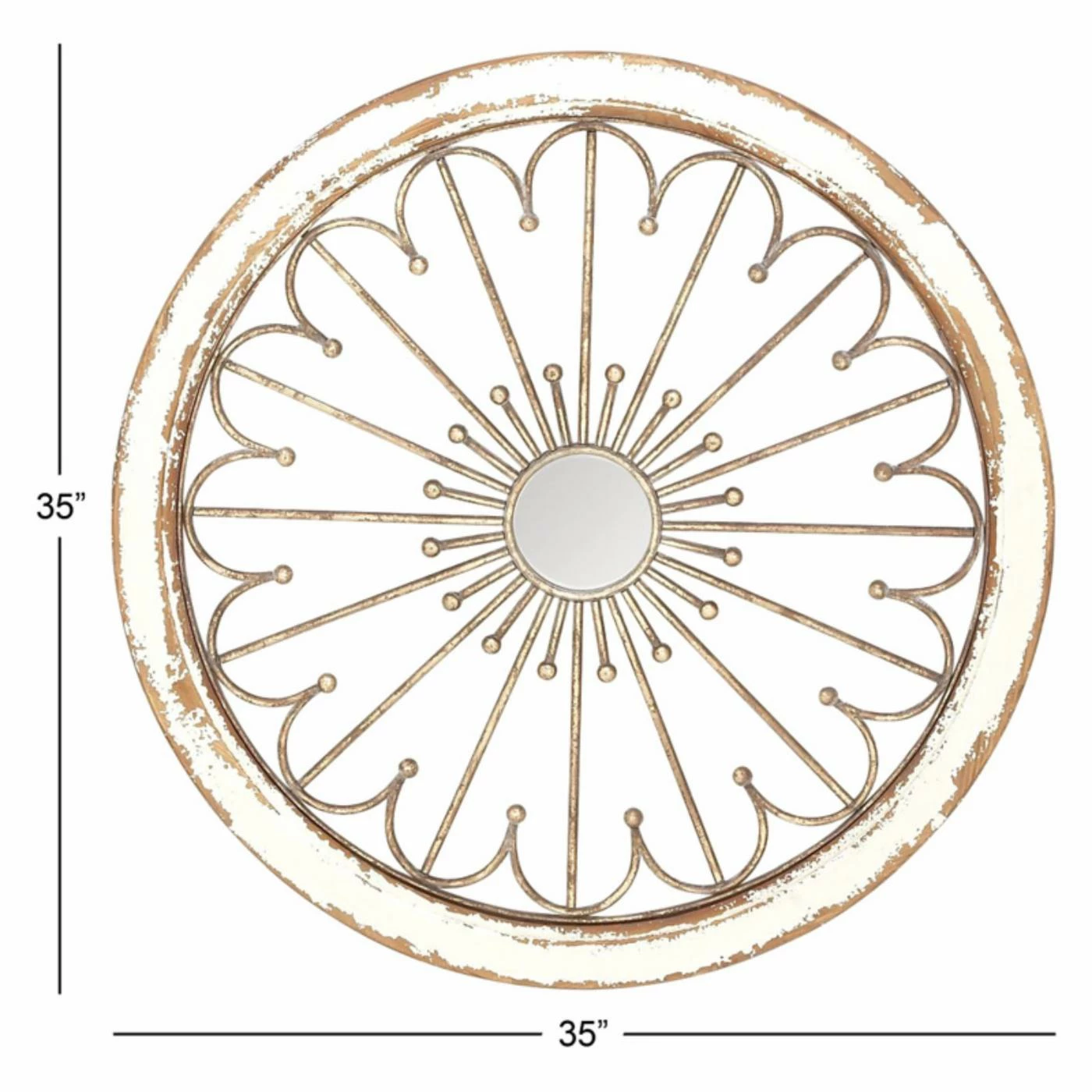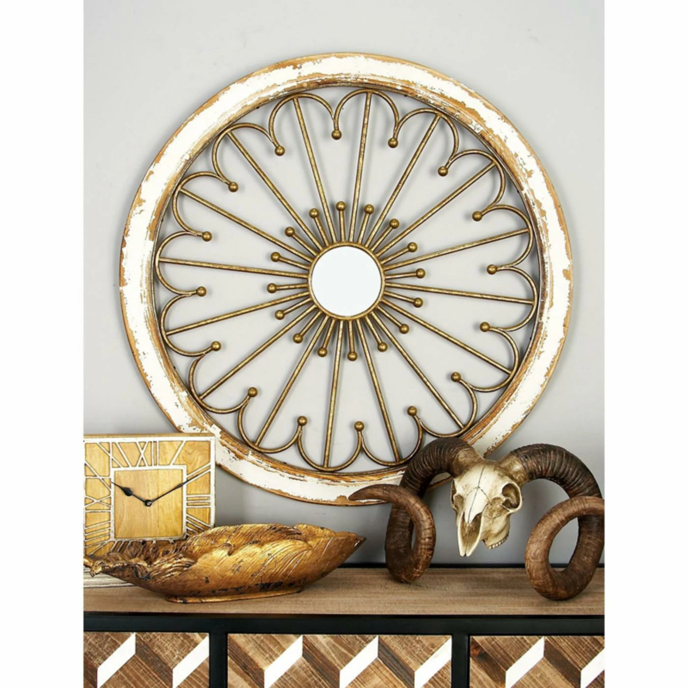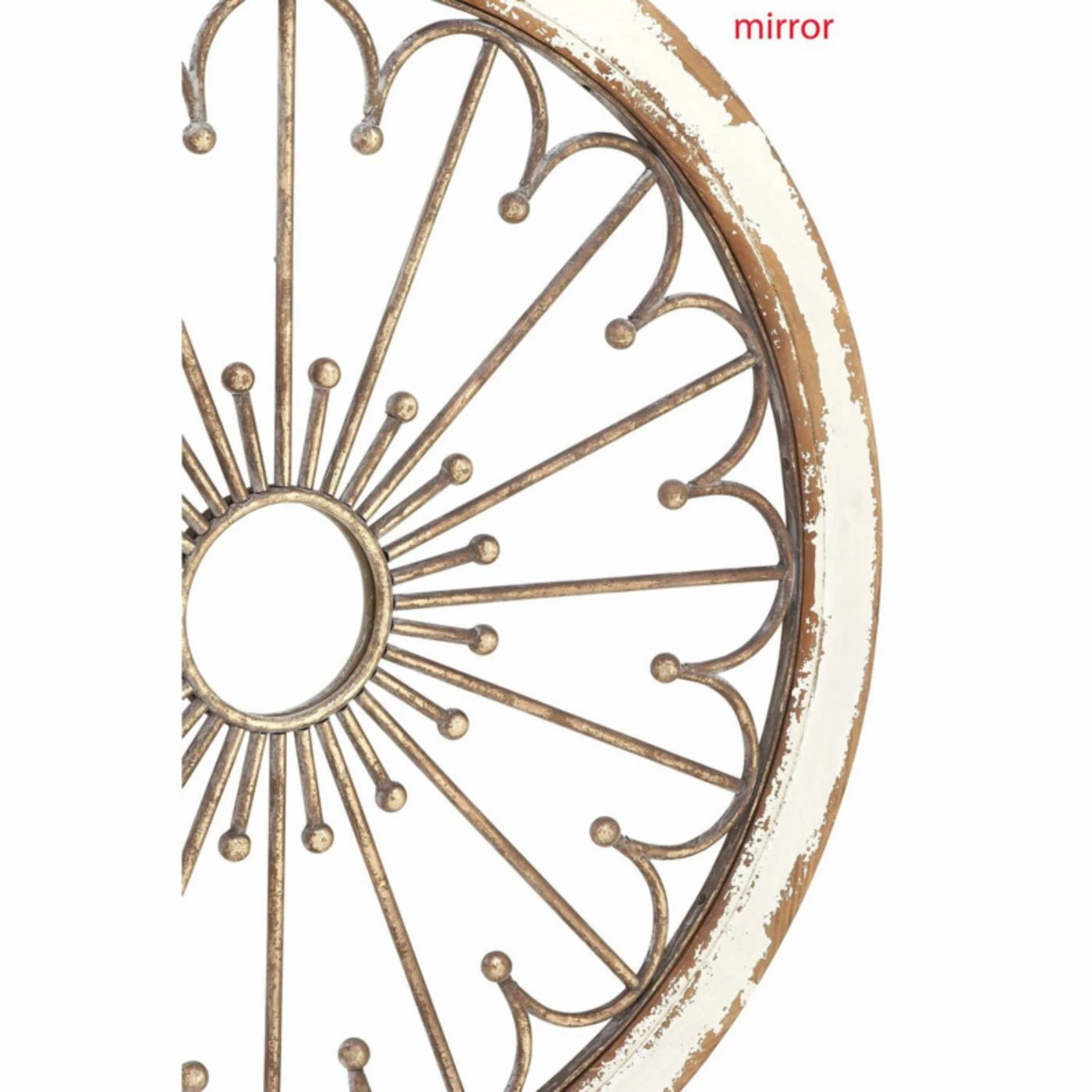 The DecMode Radial Pattern Wall Sculpture has a circular shape surrounded by a cypress wood frame, finished in distressed white for shabby chic style. Slender rods of iron in a radial pattern are applied over the middle, while a mirrored surface reflects the light.