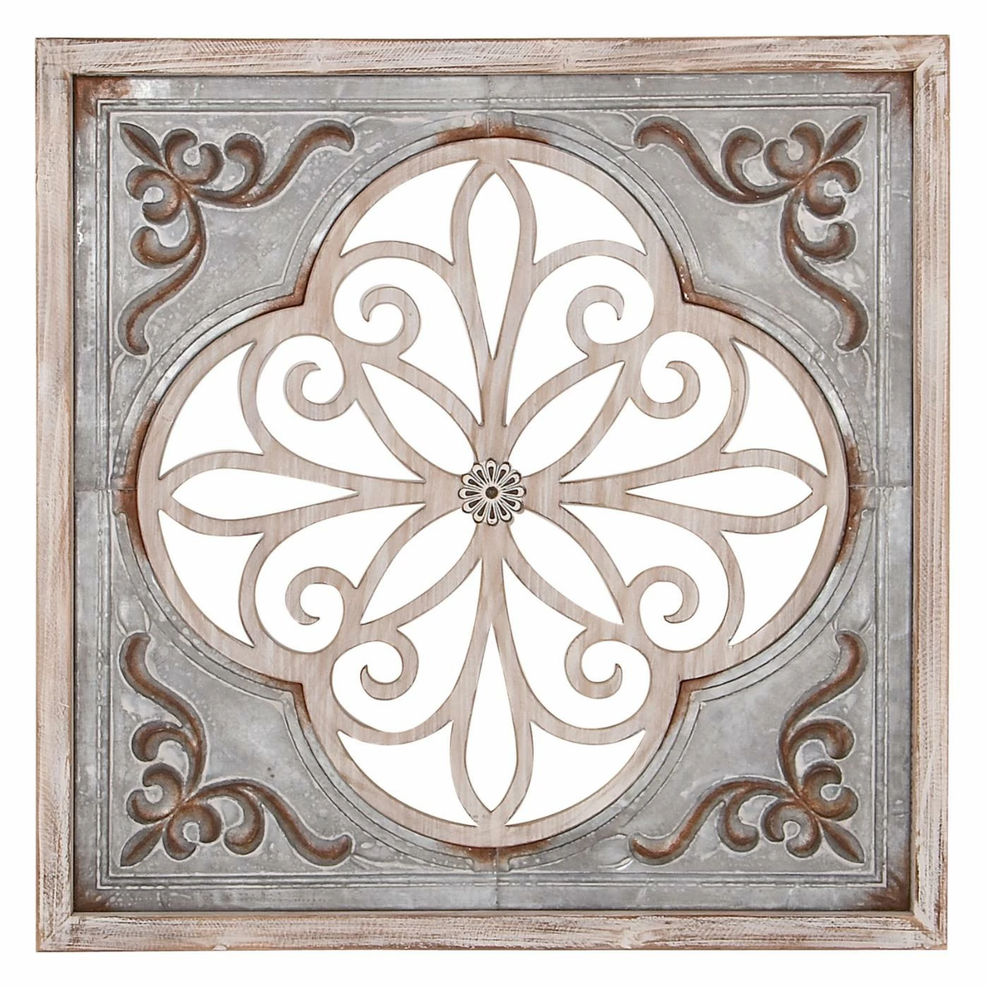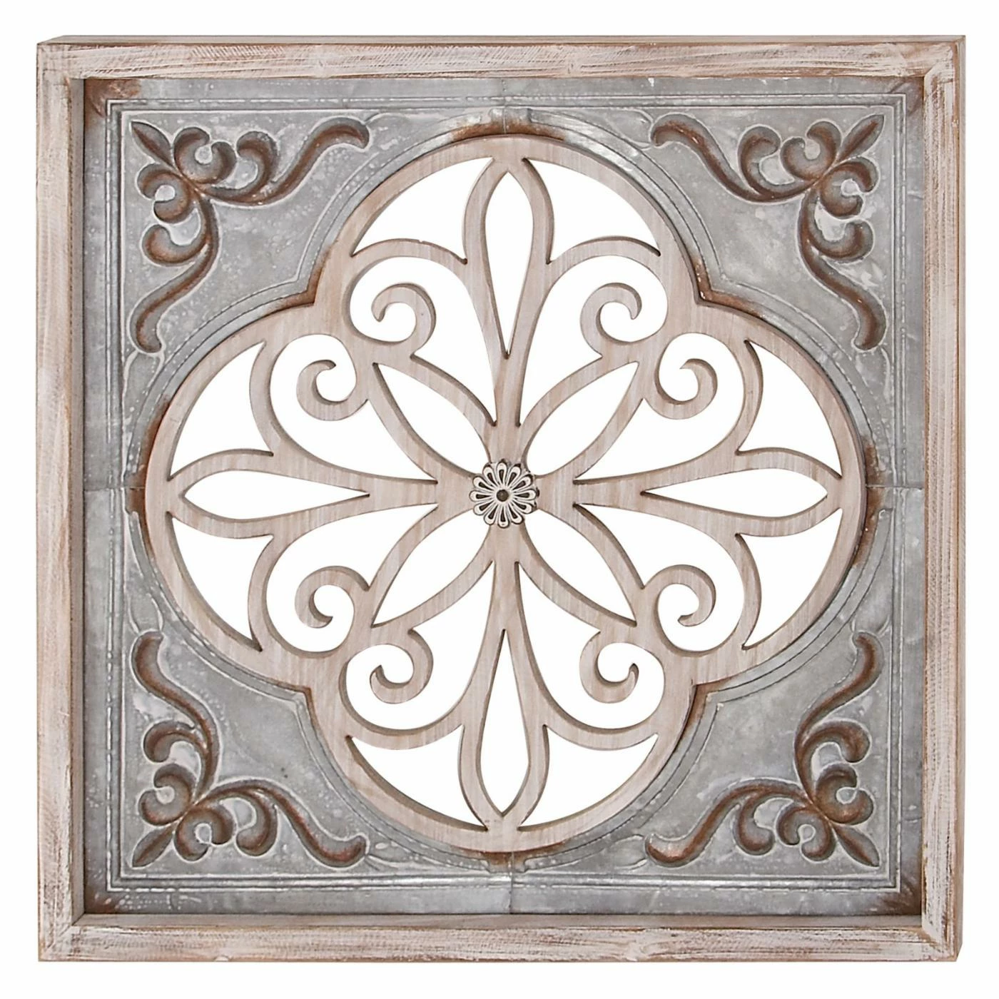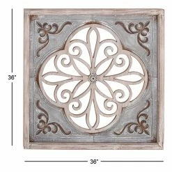 Add some Old World allure to your dΓ©cor with the DecMode Traditional Flourish Wall Decor. The square wall art piece features an elegant carved rosette with scrollwork at each corner. For a timeworn vibe, the solid fir, engineered wood, and iron wall dΓ©cor is heavily distressed.