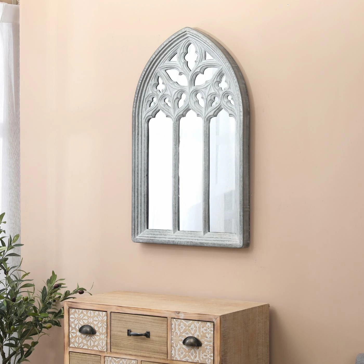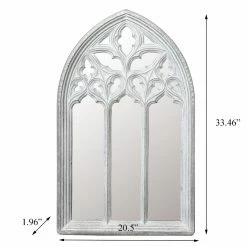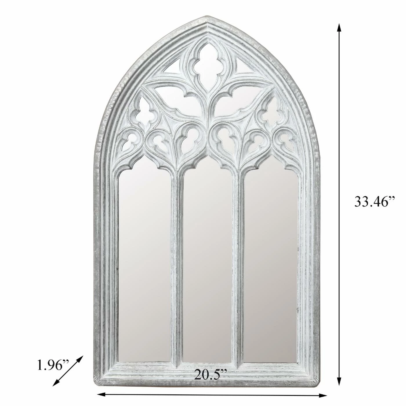 This lovely LuxenHome Distressed Metal Arched Window Wall Accent Mirror features a classic style and timeworn beauty. The cathedral frame has a white-washed finish that gives the mirror a vintage look. The cathedral mirror will feel at home in your entry, above your mantel or in your powder room. The wall mirror makes a gorgeous statement. The wall mirror is ideally hung vertically with key holes provided at the top of the mirror.