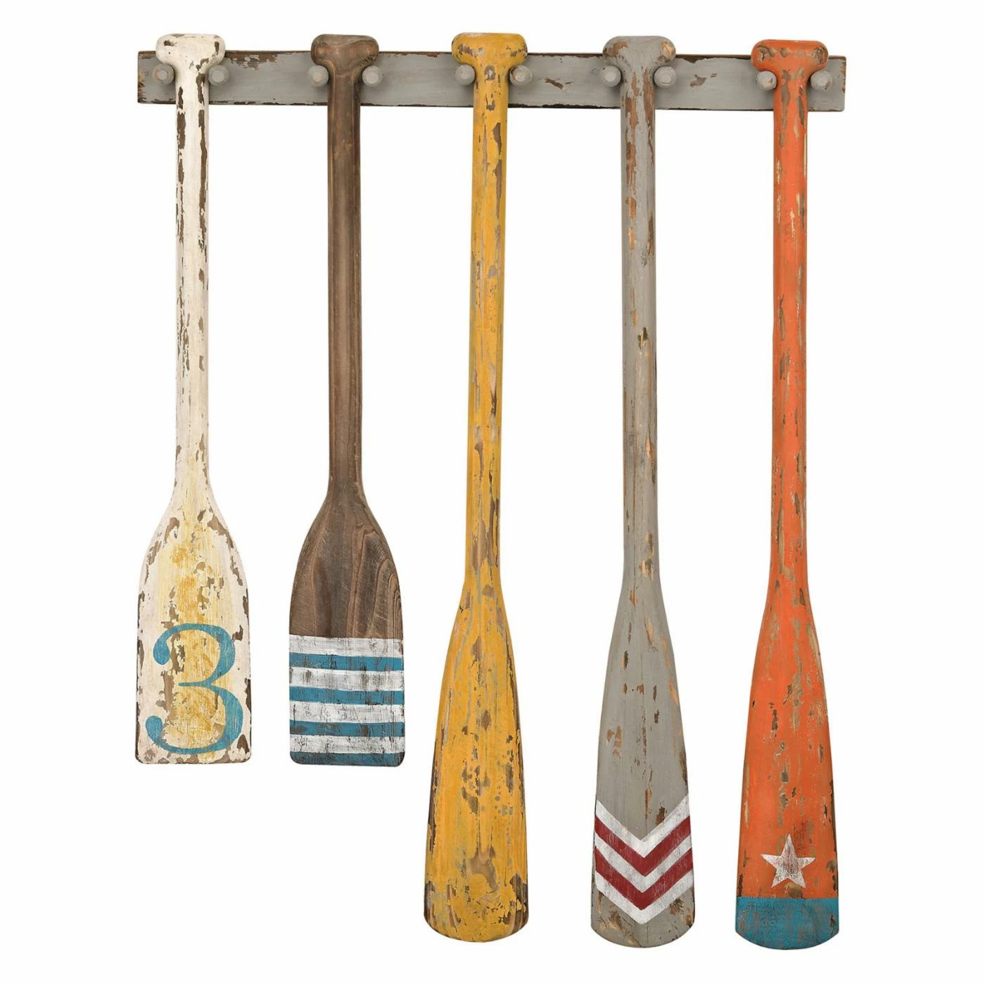 This charming Sterling Hand Painted Oars Wall Sculpture is a collection of authentic antiqued oars in a row. Hand-painted in a variety of nautical colors, they’re distressed as only the sea can do. They hang evenly from a matching gray rack, included.