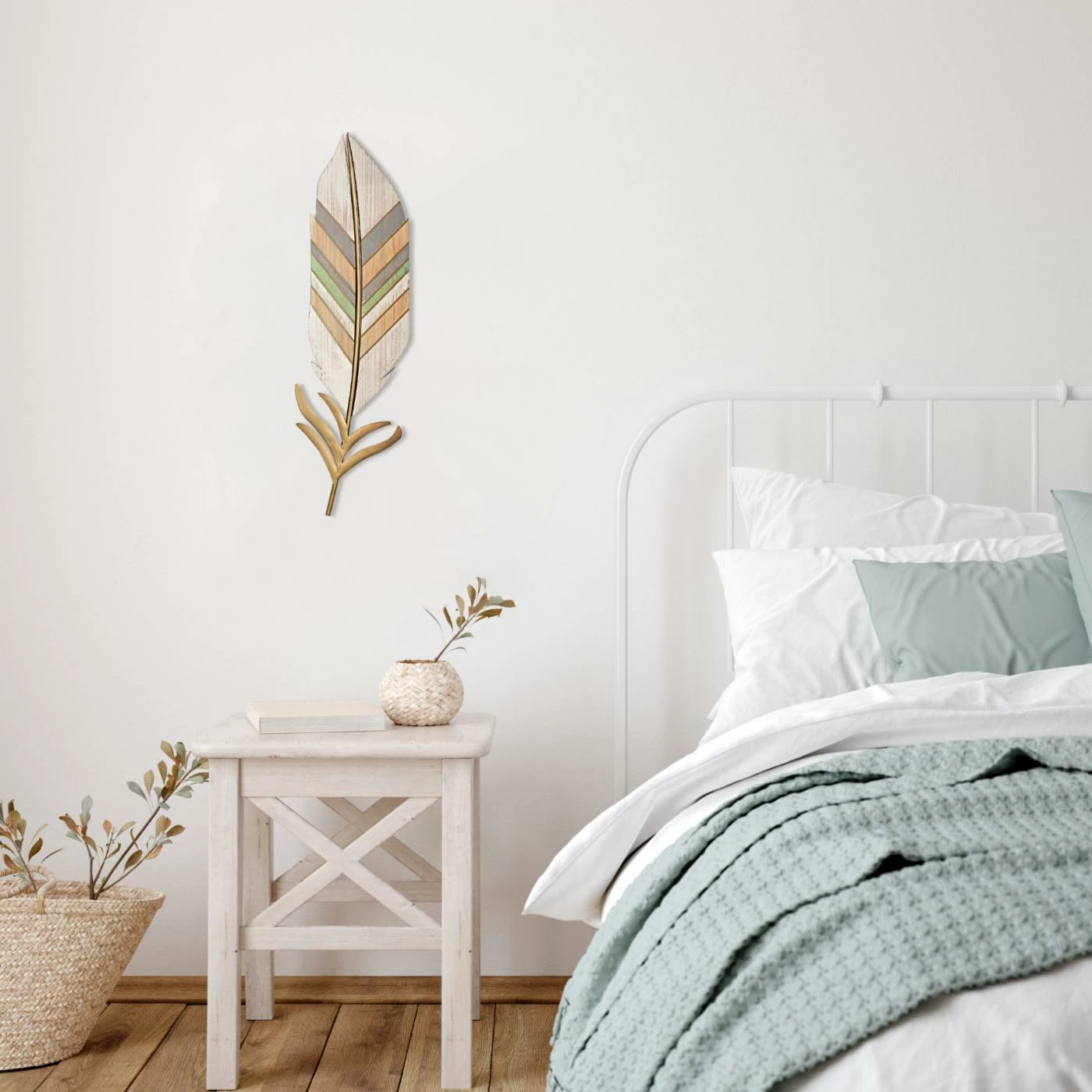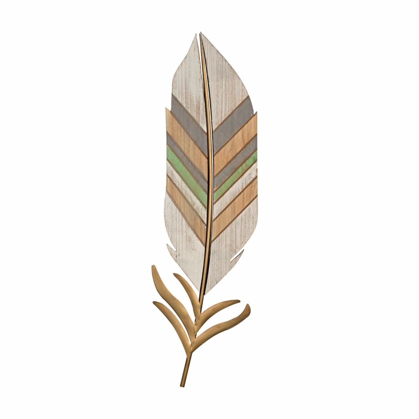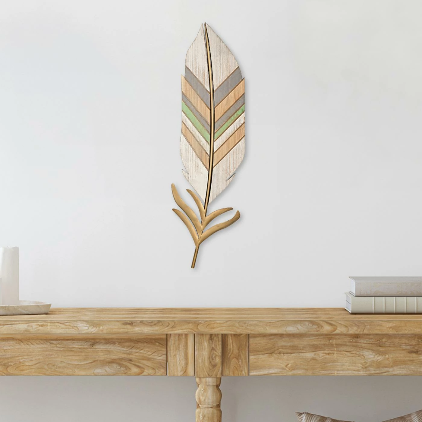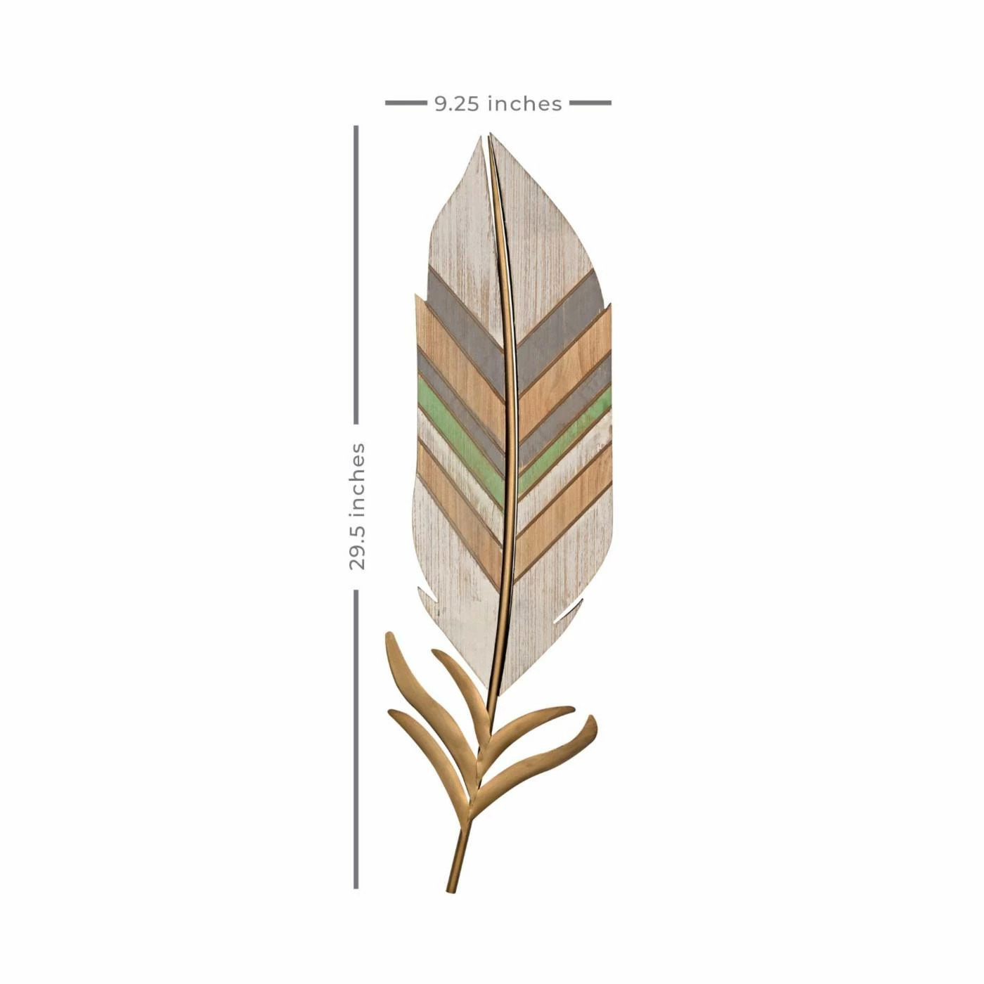Go boho in your living space with the Stratton Home Decor Boho Wall Feather. This hand-crafted metal and wood feather showcases a gold, natural brown, white, and mint green finish. Its easy to hang by the keyhole slot on the back.